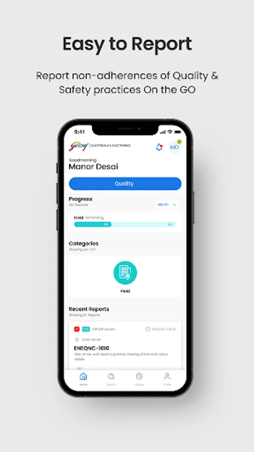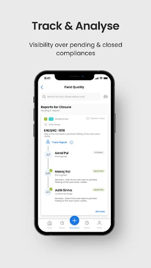 The App allows users to track the history of all reports raised or is in progress for approvals at various levels of workflow.