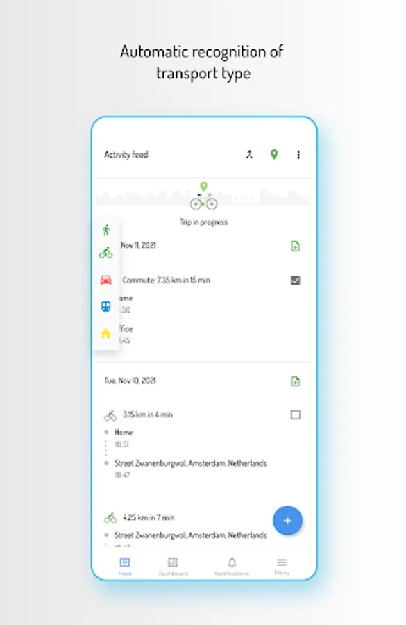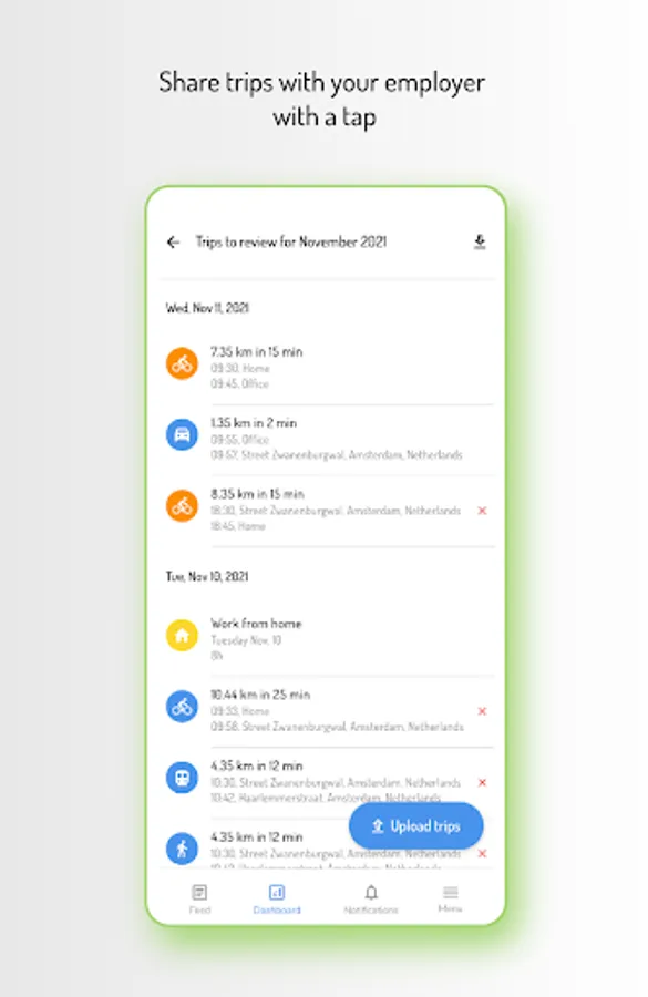 Car, public transport, bike or working from home, no matter the transport type you choose, it will be added next to your trip in the timeline.