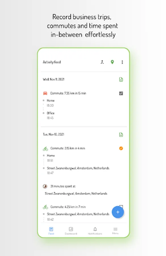 All you need to do is make sure that the tracker function in the app is turned on and all the trips will be displayed in your timeline. Don’t worry if you have forgotten to turn on the tracker or the location service, you can easily add the missing trips manually.