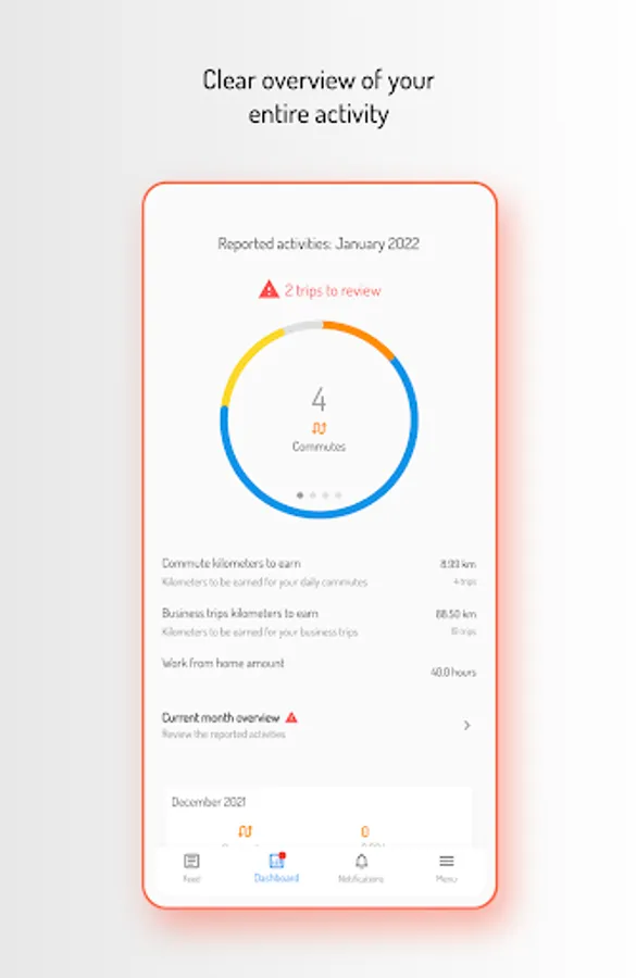 The dashboard will show you the kilometers earned for each of your business trips for the current month.