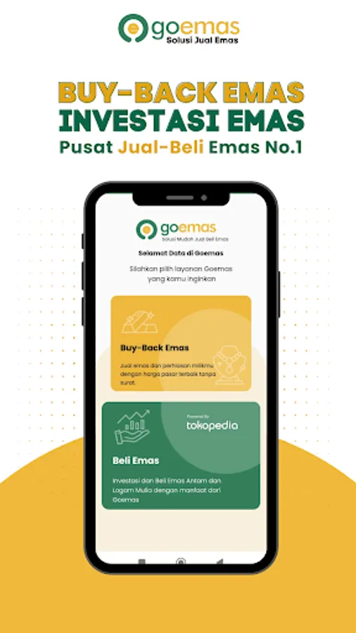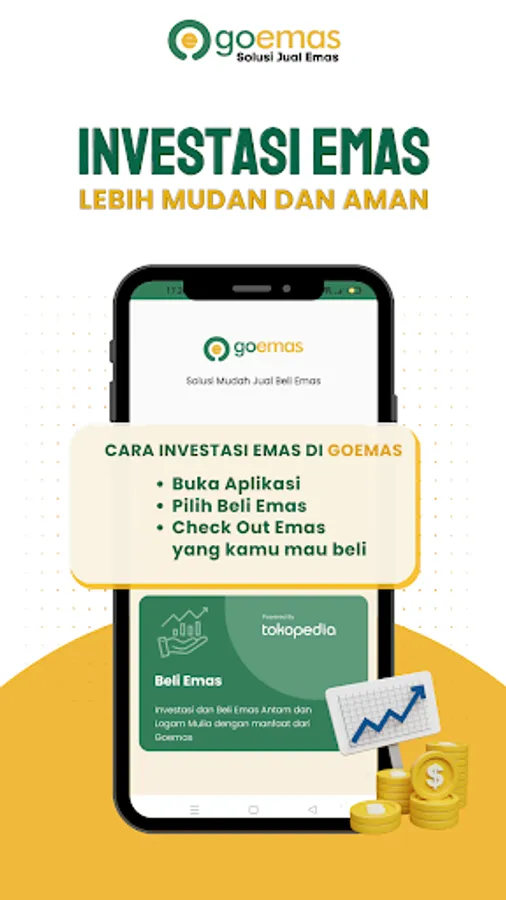 Aplikasi Goemas juga menyediakan fitur investasi, kamu bisa membeli Logam Mulia tanpa harus keluar rumah dan melalui aplikasi Goemas kamu bisa mendapatkan banyak Cashback yang hanya bisa didapatkan jika bertransaksi melalui aplikasi Goemas dengan mitra penjualan kami Tokopedia dimana kami memiliki stok yang melimpah jadi jangan khaatir kehabisan barang.
