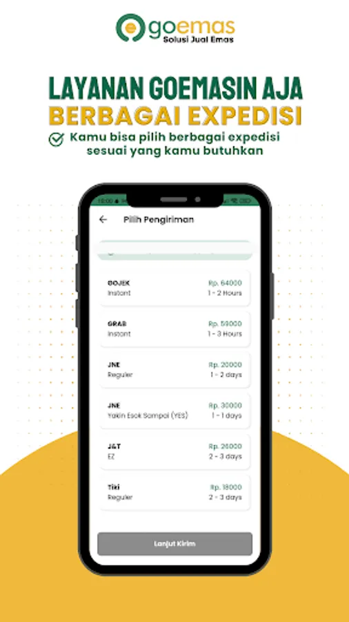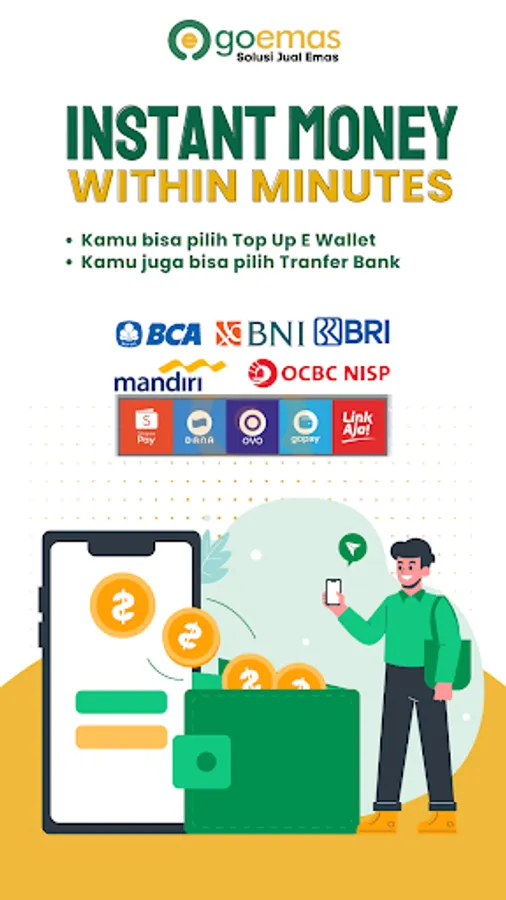 Aplikasi Goemas menyediakan layanan yang sangat gampang untuk jual emas. Penjualan emas dalam aplikasi ini bisa melalui 3 layanan dan metode pembayarannya pun bisa melalui bank transfer segala jenis bank tanpa biaya admin. Eittss.. Aplikasi ini bisa juga melakukan pembayaran melalui E-Wallet lho.. seperti OVO, Shopeepay, Gopay, LinkAja, Dana,atau kamu bisa juga mengirimkan barcode E-Walletmu.