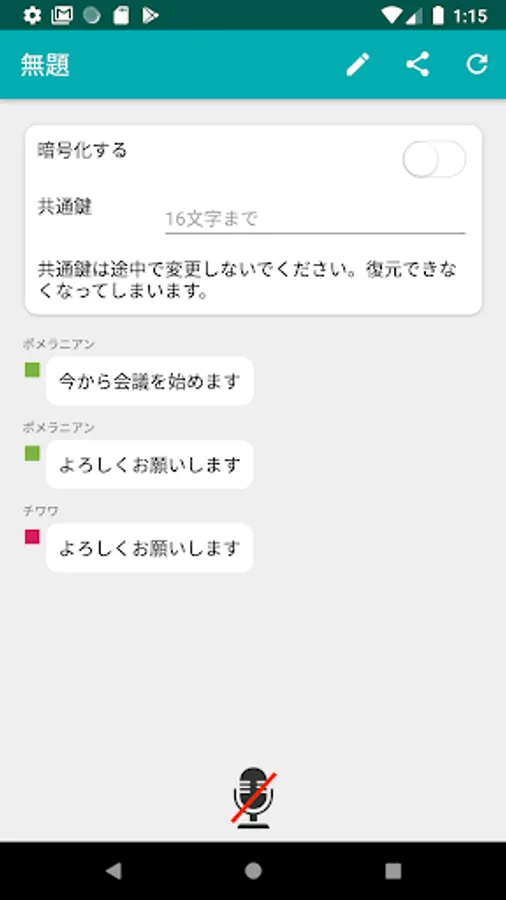 Recognized text can be encrypted. To encrypt, enter any 1-16 digit character that will be the key. This key is a common key that is also used when decrypting. If there are other participants, please inform them of the set key and make sure not to make a mistake.