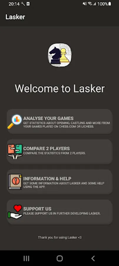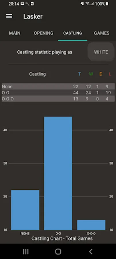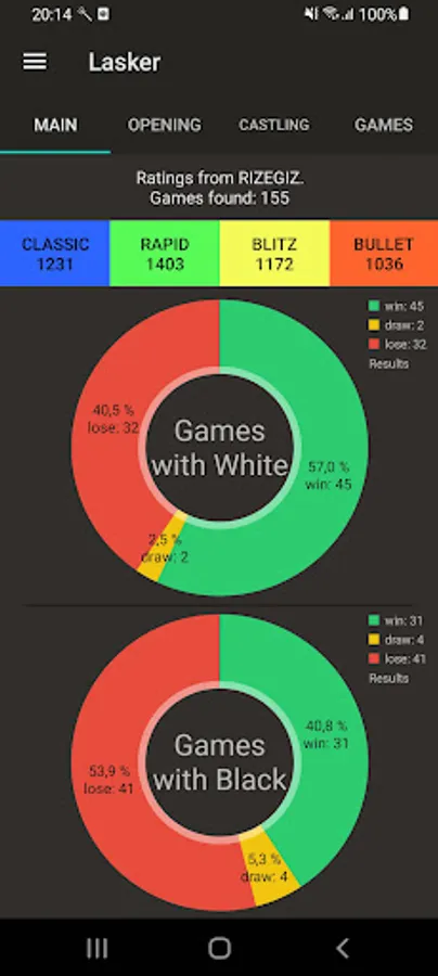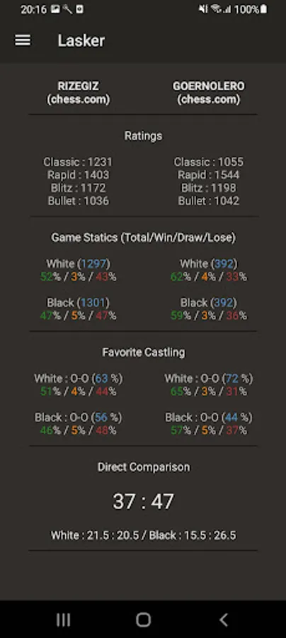 Lasker is a chess analysis app for Chess.com and Lichess.org. With Lasker you can analyse your games, view opening and castling statistics, compare yourself with other players and much more.