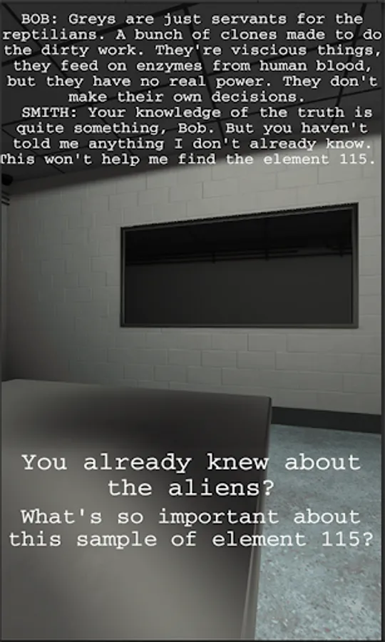 In this game, you play as Bob, a devoted lifelong researcher tirelessly working in a classified underground facility. After discovering an element that may be our connection to extraterrestrials and an understanding of our origins, you are taken by unknown actors under suspicious circumstances.