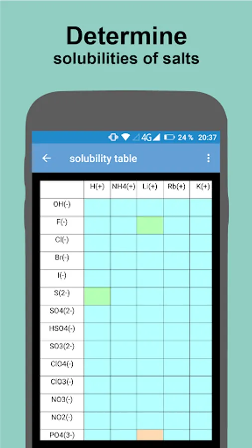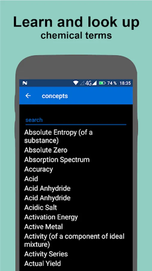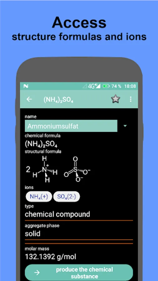 The app contains basic substance information such as melting point, boiling point, state of aggregate, molar mass and density. This information is stored in a database for a large number of chemical compounds and elements, so that the app can also be used offline.