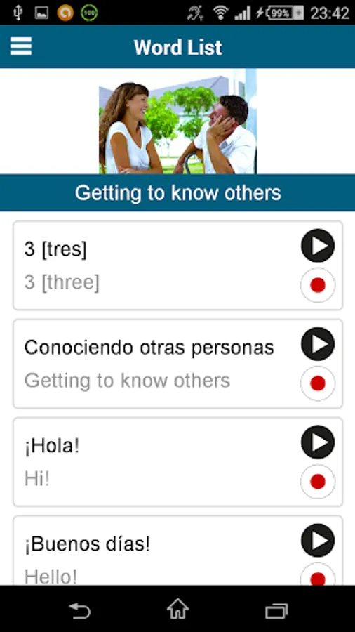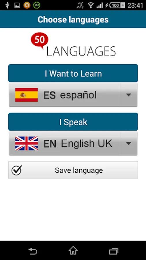 Learn Spanish now! - "50 languages Spanish" (www.50languages.com) contains 100 lessons that provide you with a basic vocabulary of the Spanish language. This free app has 30 lessons. With no prior knowledge, you will learn Spanish and fluently speak short Spanish sentences in real-world situations in no time.