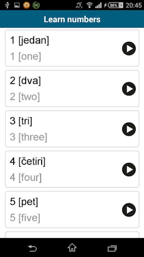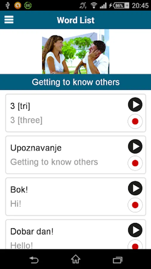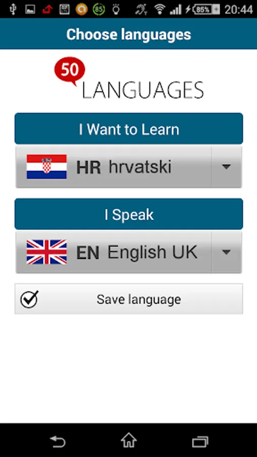 Learn Croatian! "Croatian 50 languages" (www.50languages.com) contains 100 lessons that provide you with a basic vocabulary. This free app has 30 lessons. With no prior knowledge, you will learn to fluently speak short sentences in real-world situations in no time.