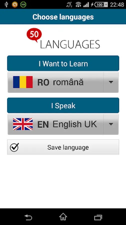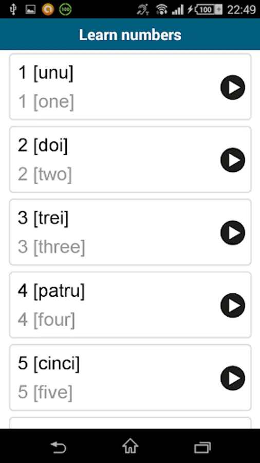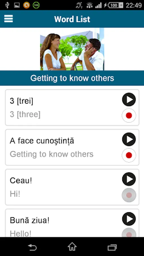 Learn Romanian! - "Romanian 50 languages" (www.50languages.com) contains 100 lessons that provide you with a basic vocabulary. This free app has 30 lessons. With no prior knowledge, you will learn to fluently speak short sentences in real-world situations in no time.