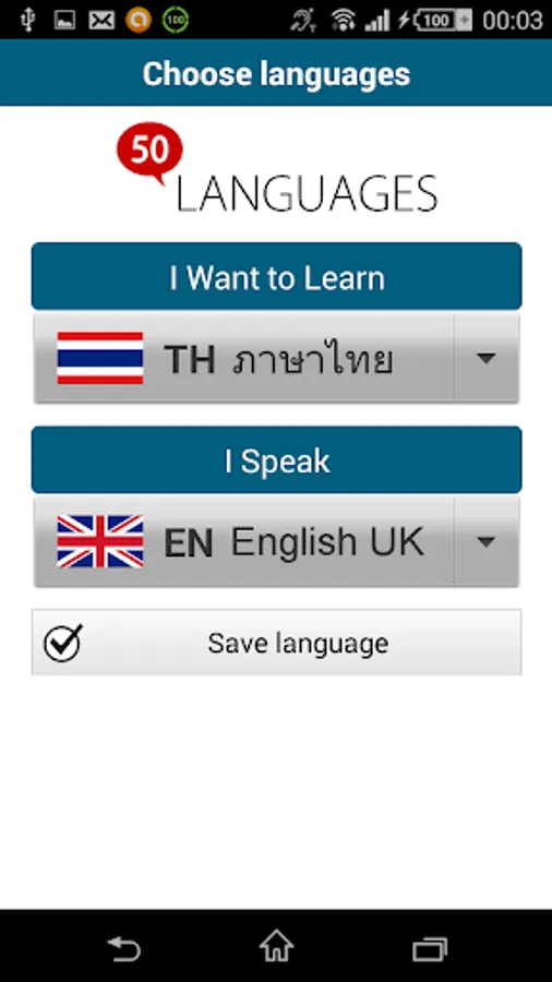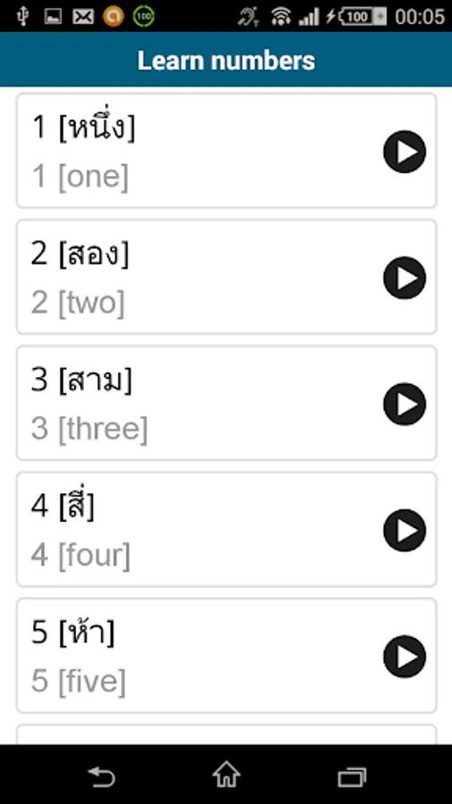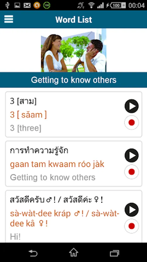 Learn Thai! - "Thai 50 languages" (www.50languages.com) contains 100 lessons that provide you with a basic vocabulary. This free app has 30 lessons. With no prior knowledge, you will learn to fluently speak short sentences in real-world situations in no time.