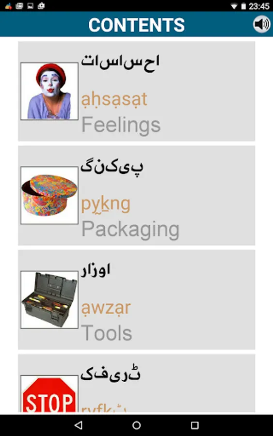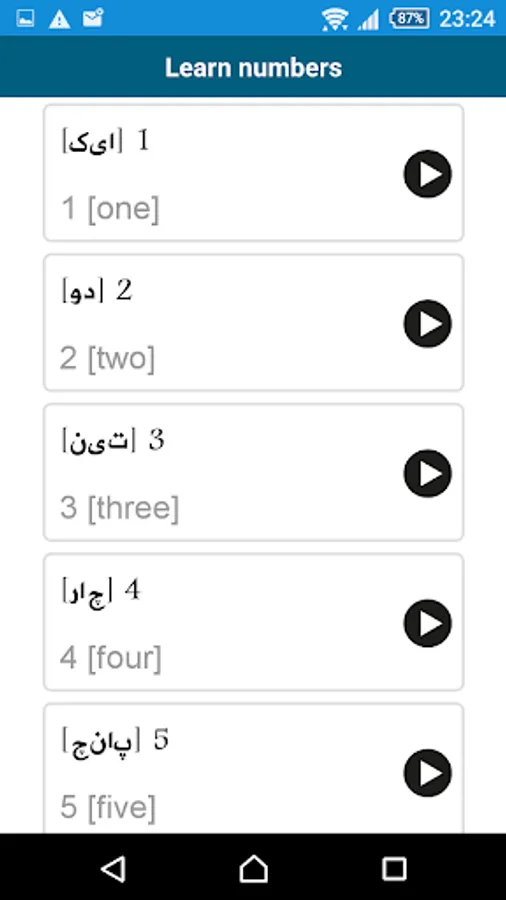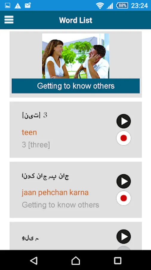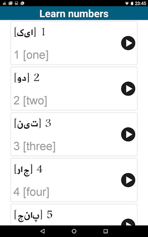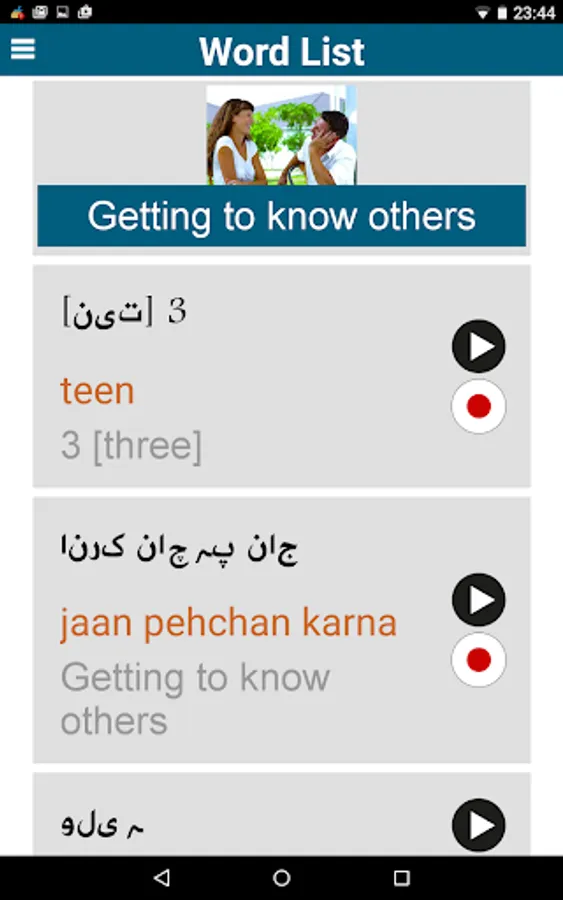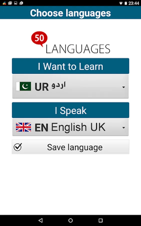 Learn Urdu! - "Learn Urdu 50 languages" (www.50languages.com) contains 100 lessons that provide you with a basic vocabulary. This free app has 30 lessons. With no prior knowledge, you will learn to fluently speak short sentences in real-world situations in no time.