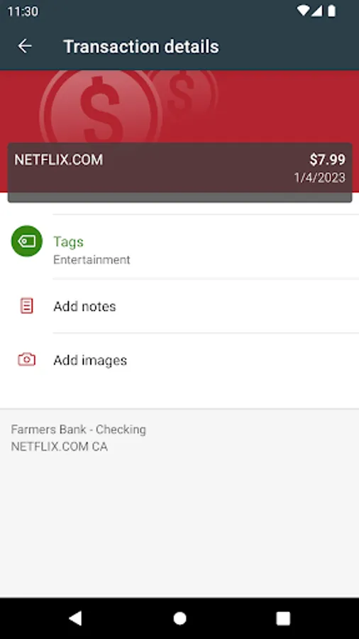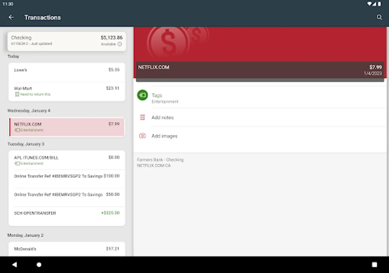• Keep your transactions organized by allowing you to add tags, notes and photos of receipts and checks.