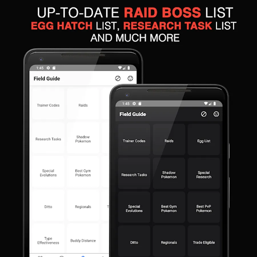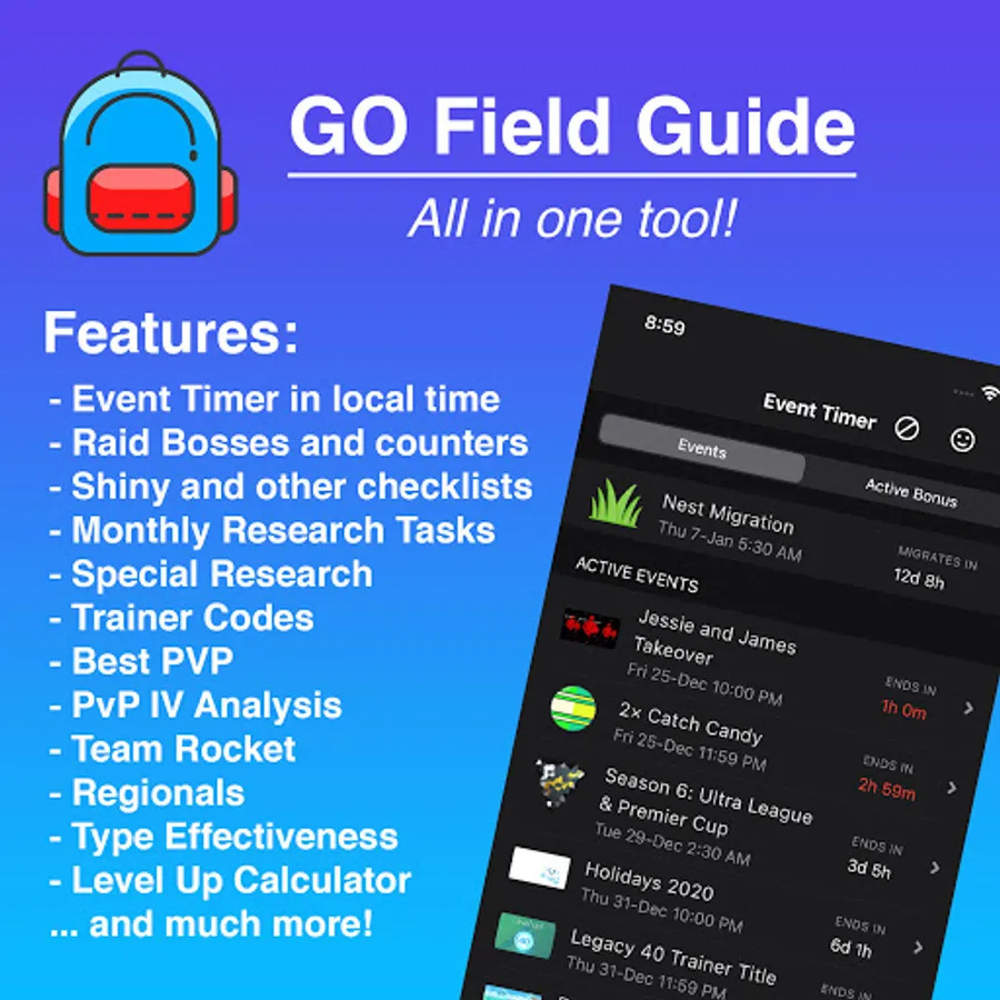 GO Field Guide tool is made to assist you in playing Pokemon GO, It has up-to-date information for all Events along with local time, Raid Guides, Research task and rewards, Egg Hatch list, Checklist and much more...