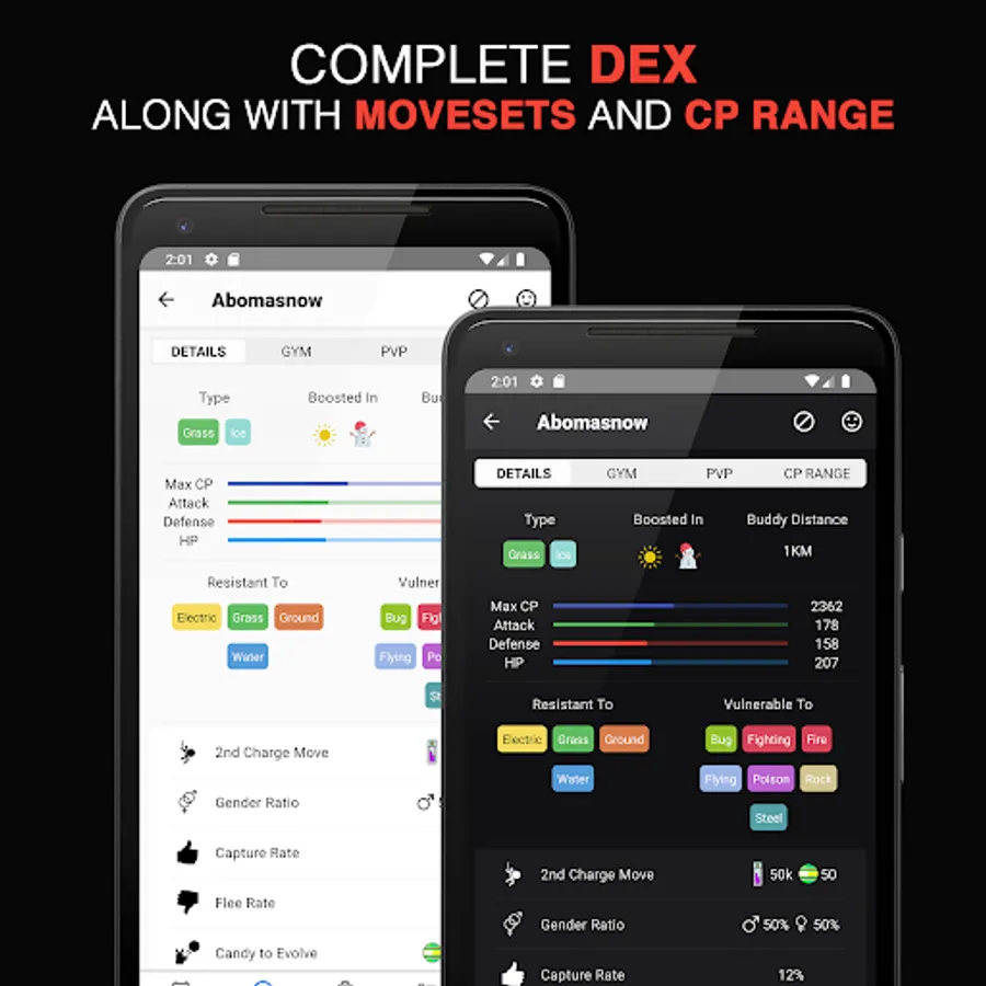 Complete Dex with complete details about the Pokemon along with Gym, PvP Movesets and CP Range for all levels.