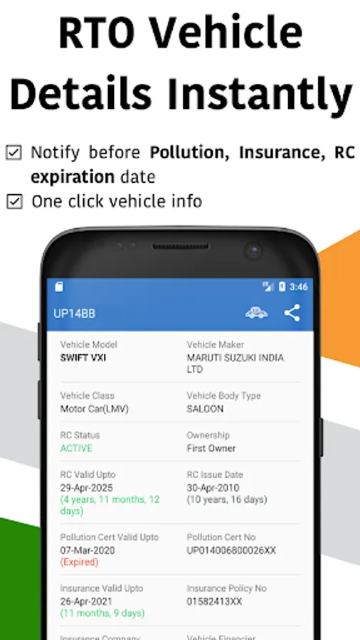 Includes Insurance Validity, Pollution Validity, Vehicle Age etc.