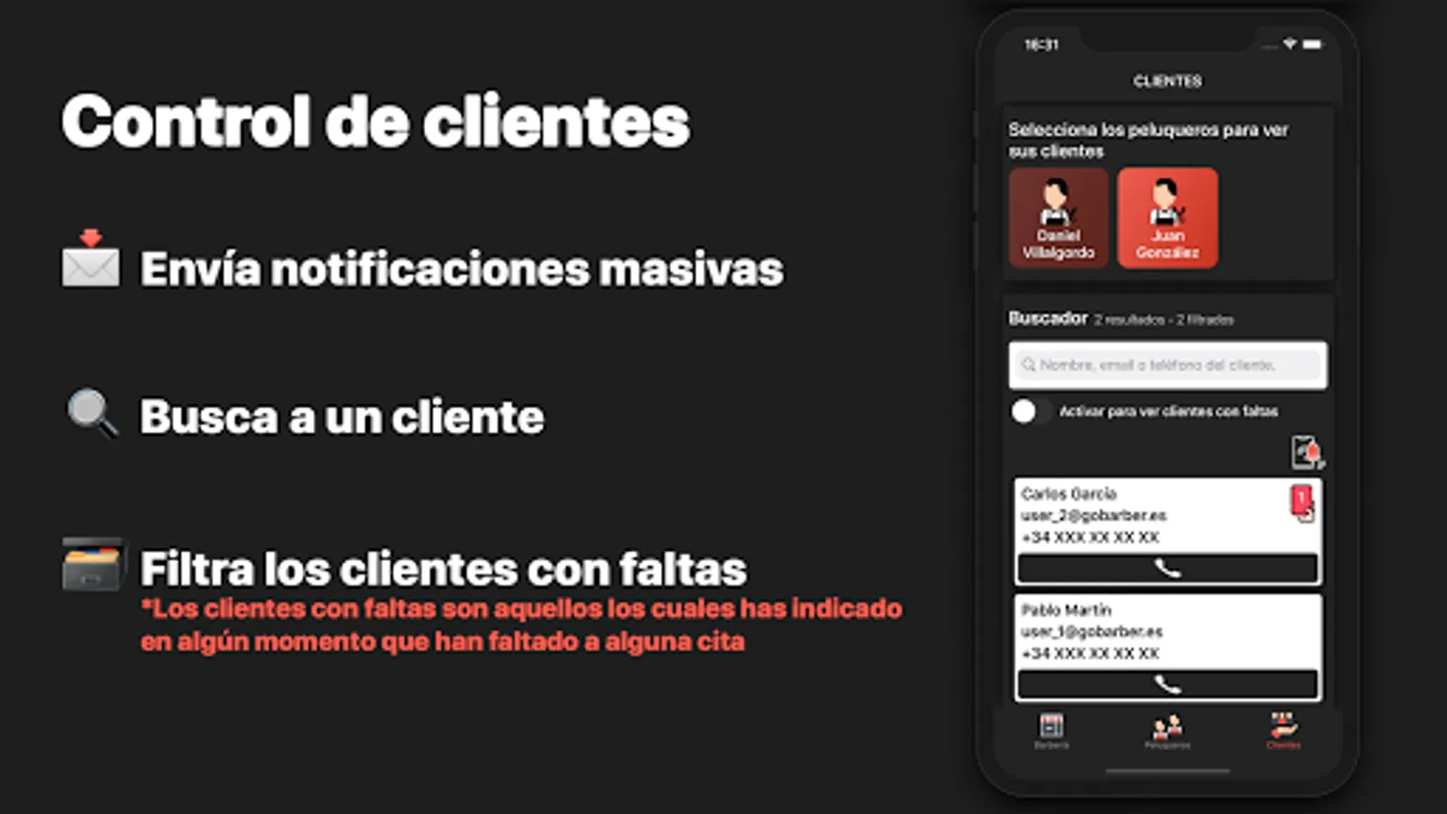 Say goodbye to calls! GoBarber makes it easy to manage the day-to-day needs of your barbershop from your mobile device. Book an appointment, apply a discount or send mass messages to your clients without a phone call and in just a few clicks. You also have the possibility of adding an unlimited number of barbers at no additional cost.