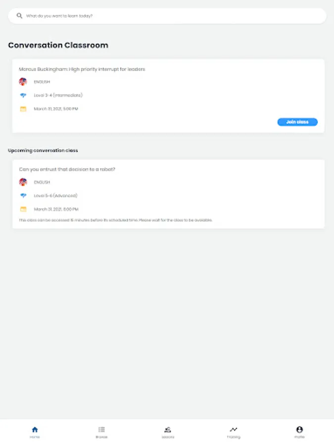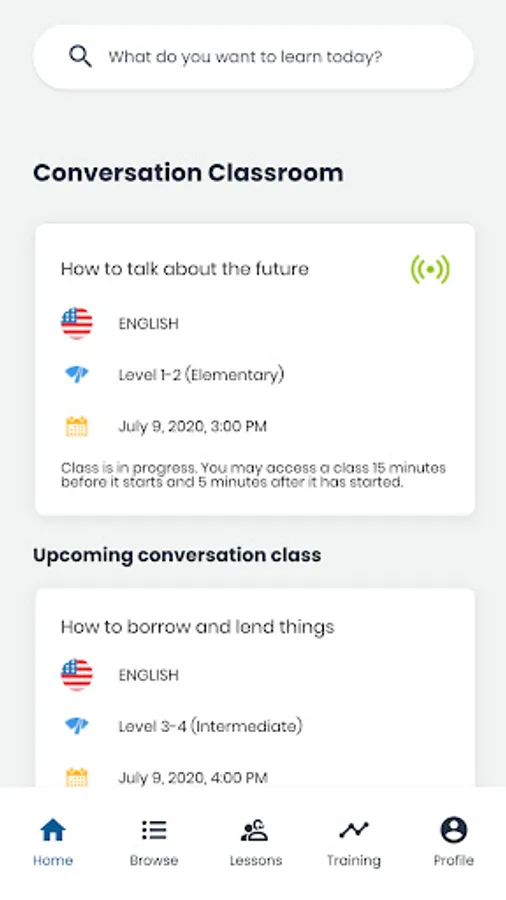 Engaging small group classes at every hour. Join a live-streaming class that suits your schedule, interest, or objective. Regularly practice your communication skills and interact with a trainer and other learners through live chat and audio.