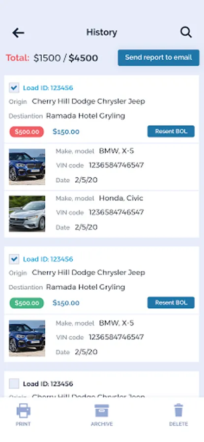 Are you looking for a load that is the most suitable for you? Are you a hotshot car hauler or working for the company? Use GOFORIT for Transporters to check available loads near you, Send offers, Accept rates, or negotiate them. Contact dealers or brokers directly from the app. Simply switch on/off your availability on the map so dealers and brokers will/will not see where you currently are to send you loads. Set your searching criteria, such as minimum $ per mile per car, number of cars you can take, are you willing to take INOPs or not, do you have an enclosed trailer? Once the load is booked you will get all required information instantly, then you can contact pickup and destination parties, inspect the vehicle, obtain electronic proof of pickup or delivery. Our inspection diagram is the easiest to use and very helpful whether you are transporting old vehicles not requiring thorough inspection or expensive vehicles when you are required to mark damages by sizes and exact location. If you are an owner-operator working for your own company GOFORIT App is an absolutely great tool to track payments, simply mark paid loads as green and unpaid as red, GOFORIT history page provides statistics on how much you make as a driver or owner-operator.