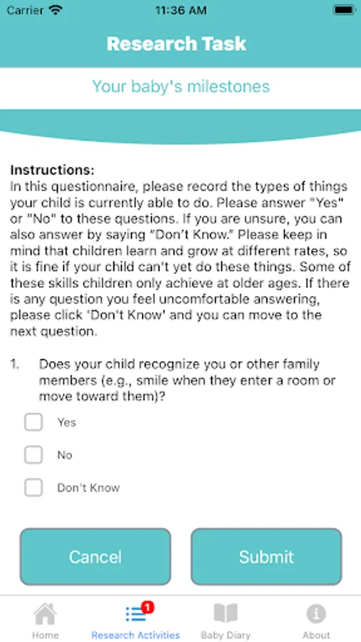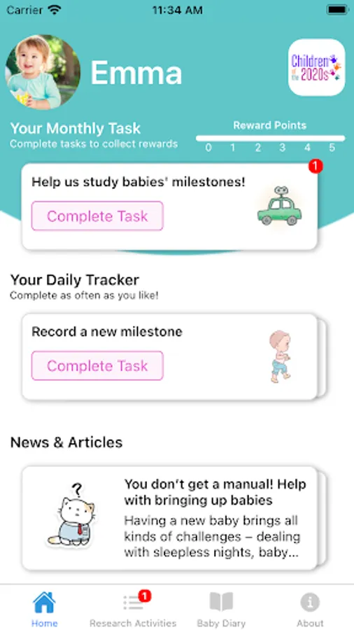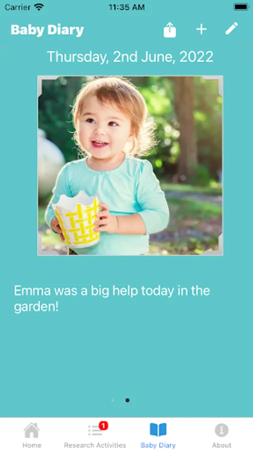 In addition to study participation, the Children of the 2020s mobile app provides a Baby Diary that allows parents to capture their children's most precious photos and videos.