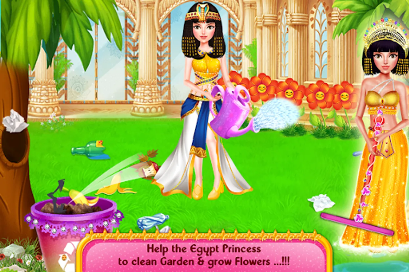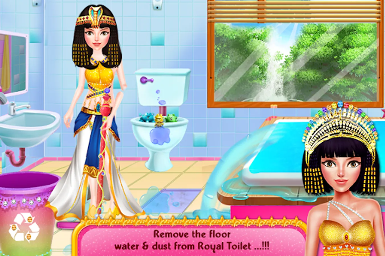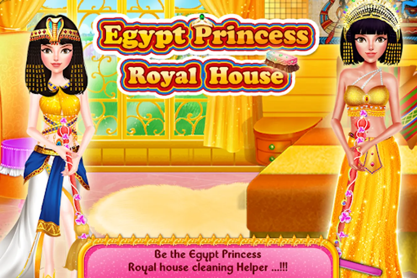 Egypt Princess Royal House Cleaning girl’s games is a fusion of mini girl’s games of household, chores like bedroom cleaning, toilet cleanup, kitchen chores, garden decoration, rugs cleansing, dish washing and renovate, the interior décor. Imagine being a themes artist and doing a magical makeover of your dream palace by going over different era’s artistic styles, like modern vintage, empire temple look, fashionable castle interior or royalty of hidden kingdom. You can give your imaginary land a majesty look with adding luxury furniture and pleasure dome. You can make the place look like a house of magnificent secrets. As the housekeeper has overlord of work you may also help in cleaning the house and floor tiles with wet mops, duster and vacuum cleaner. You have to do the hangings of ancient Egyptian girls clothes in the wardrobes as well and lastly then you have to get a princess dress Up and enter the doll home like a royalty. Don’t forget to take a look at the beautiful, garden flowers. If you are good at m managing house chores in a given time in perfect way then Egypt Princess Royal House Cleaning girl’s games are the best girl’s games for you.Let play this Egyptian doll home decoration game and be a professional decorer in this house decorating app for girls.