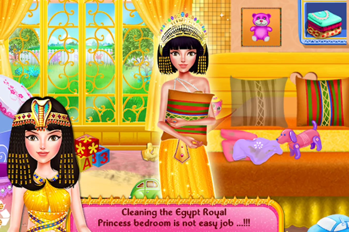 Egypt Princess Royal House Cleaning girl’s games is a fusion of mini girl’s games of household, chores like bedroom cleaning, toilet cleanup, kitchen chores, garden decoration, rugs cleansing, dish washing and renovate, the interior décor. Imagine being a themes artist and doing a magical makeover of your dream palace by going over different era’s artistic styles, like modern vintage, empire temple look, fashionable castle interior or royalty of hidden kingdom. You can give your imaginary land a majesty look with adding luxury furniture and pleasure dome. You can make the place look like a house of magnificent secrets. As the housekeeper has overlord of work you may also help in cleaning the house and floor tiles with wet mops, duster and vacuum cleaner. You have to do the hangings of ancient Egyptian girls clothes in the wardrobes as well and lastly then you have to get a princess dress Up and enter the doll home like a royalty. Don’t forget to take a look at the beautiful, garden flowers. If you are good at m managing house chores in a given time in perfect way then Egypt Princess Royal House Cleaning girl’s games are the best girl’s games for you.Let play this Egyptian doll home decoration game and be a professional decorer in this house decorating app for girls.