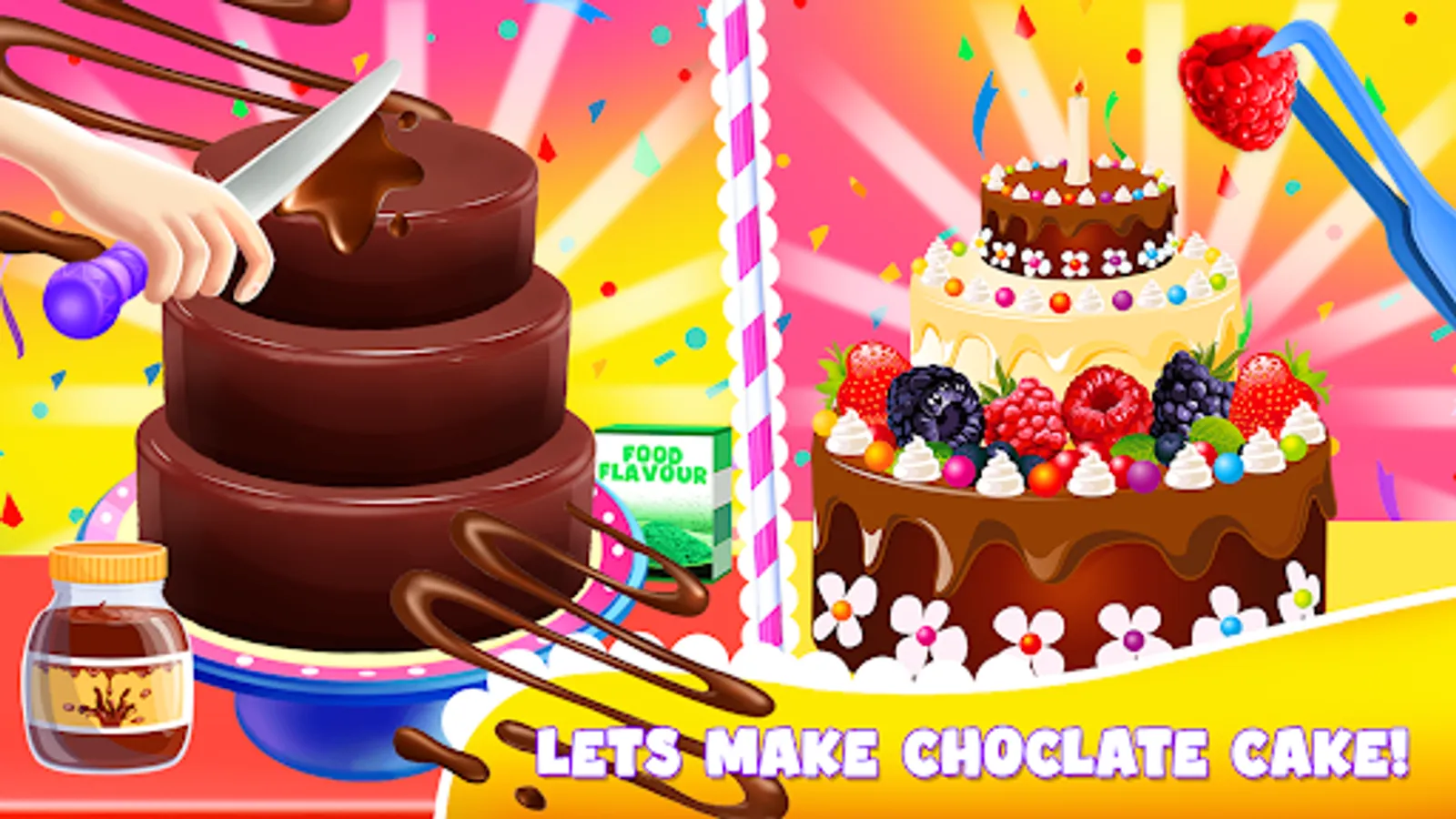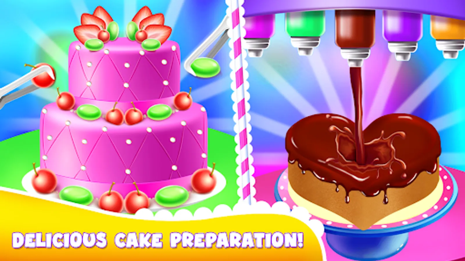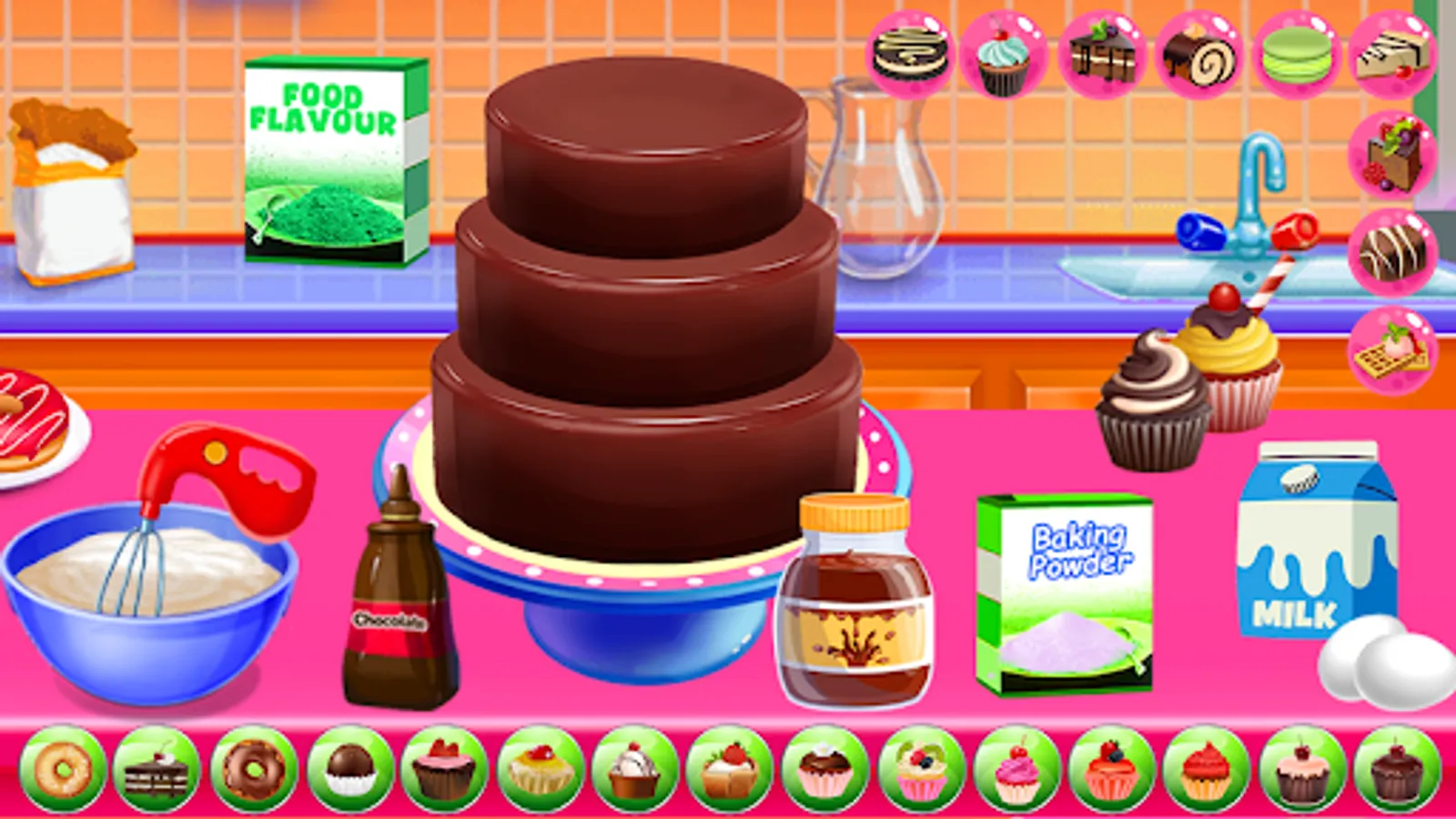 Client can order the cake for any event like birthday cakes, wedding cakes, cupcakes, Christmas baking cakes, sponge cake, biscuit cakes, baked flourless, party deserts and other sweet dishes. Little professional girls chef can make cake according to requirement in different flavor as well like chocolate cake, red velvet, funfetti cake, lemon cake, strawberry and vanilla, vintage bakes, texture frosting, stripped frosting and many more other. Huge variety of cakes and deserts are available in this kids cakes maker master cooking chef games.