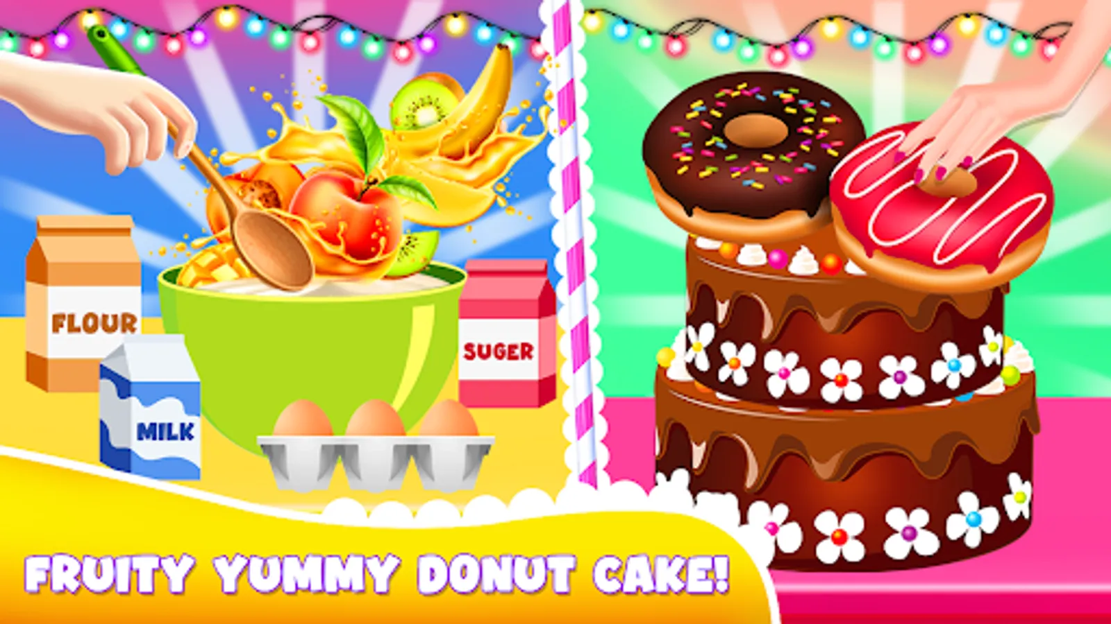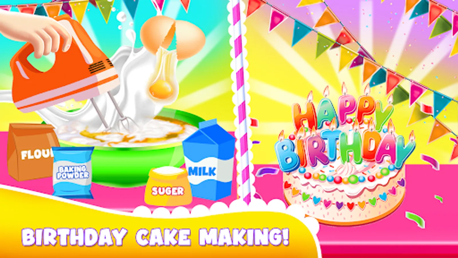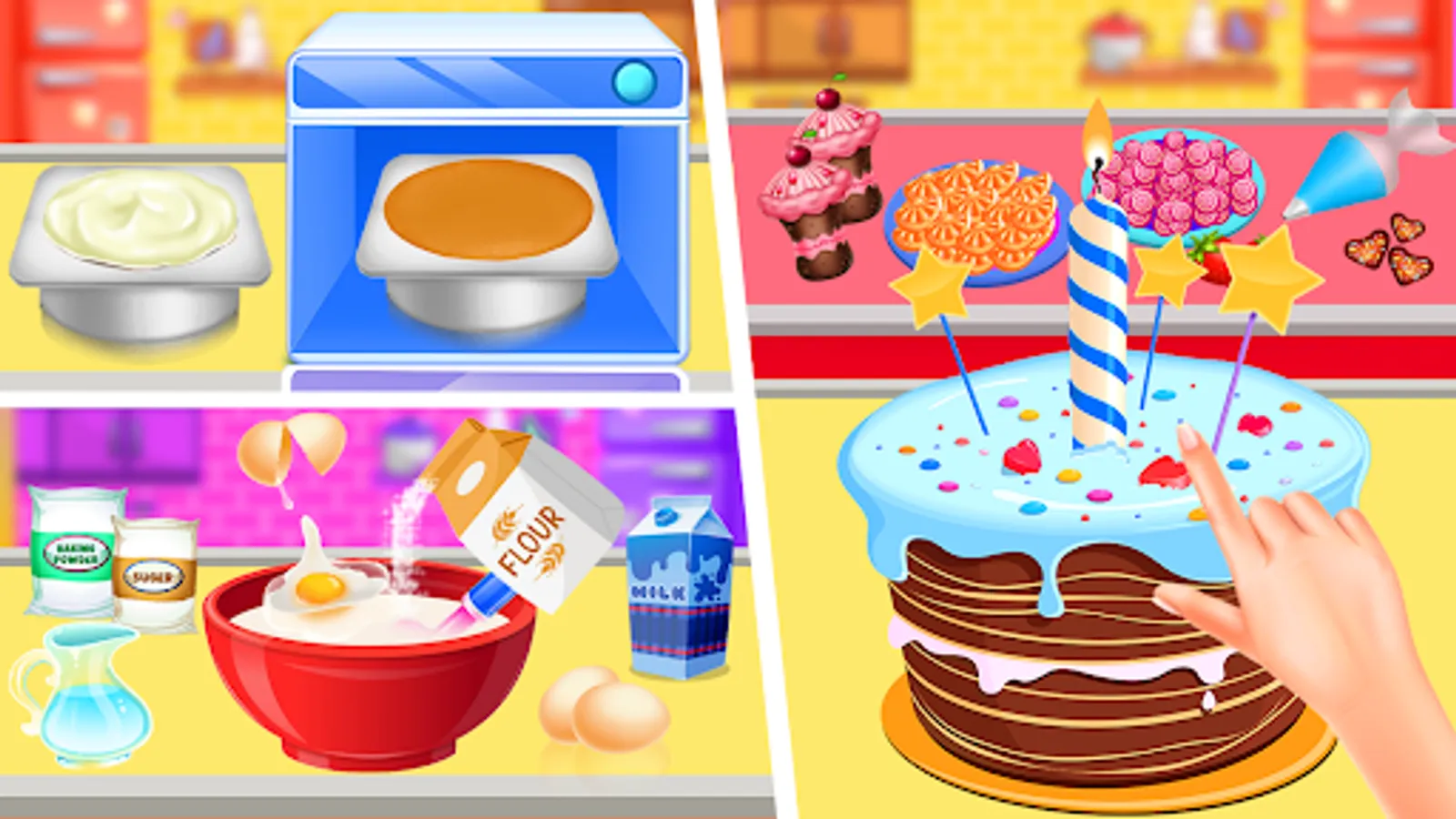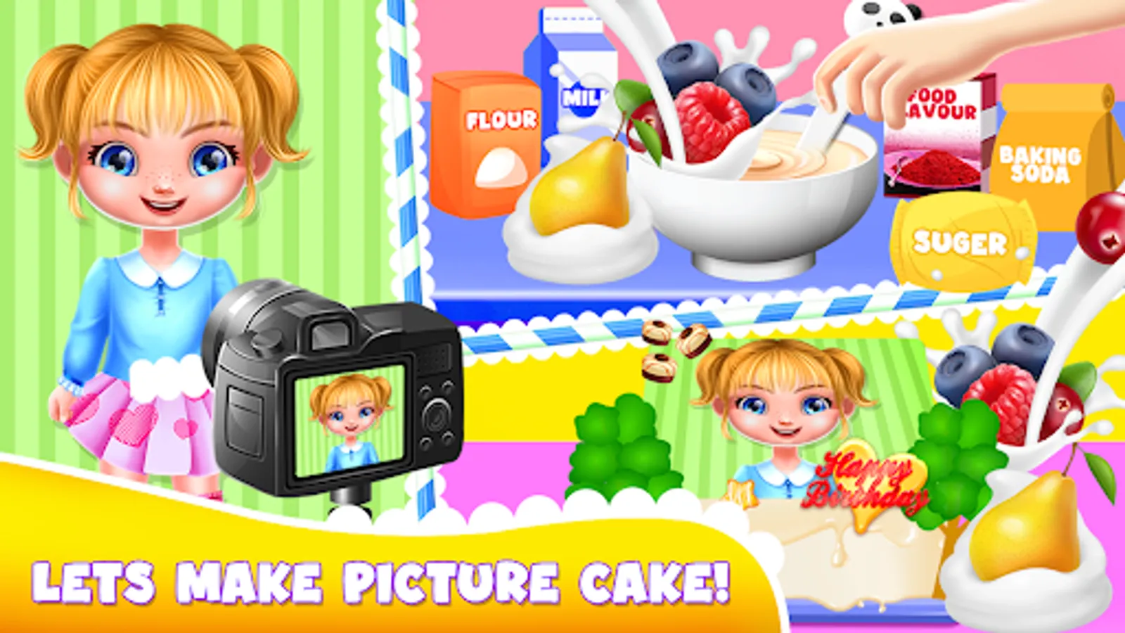 Client can order the cake for any event like birthday cakes, wedding cakes, cupcakes, Christmas baking cakes, sponge cake, biscuit cakes, baked flourless, party deserts and other sweet dishes. Little professional girls chef can make cake according to requirement in different flavor as well like chocolate cake, red velvet, funfetti cake, lemon cake, strawberry and vanilla, vintage bakes, texture frosting, stripped frosting and many more other. Huge variety of cakes and deserts are available in this kids cakes maker master cooking chef games.