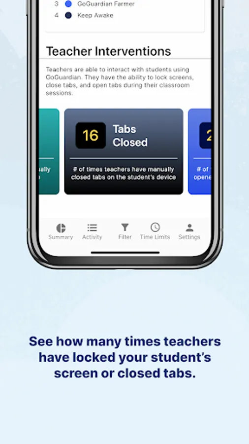 See which websites, apps, and extensions your child uses. Gain internet controls for school-issued devices at home. Also, if your child’s school uses GoGuardian Teacher, see how often teachers have issued intervention commands, like locking screens or closing tabs.