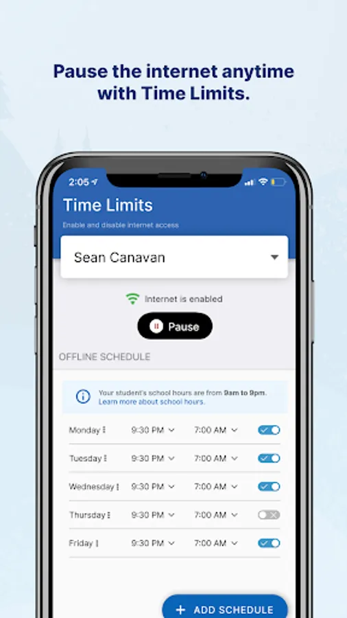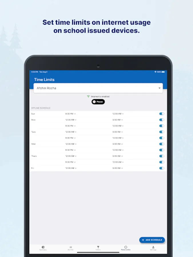 -Pause internet access on-demand or at a scheduled time on school-issued devices during out-of-school hours