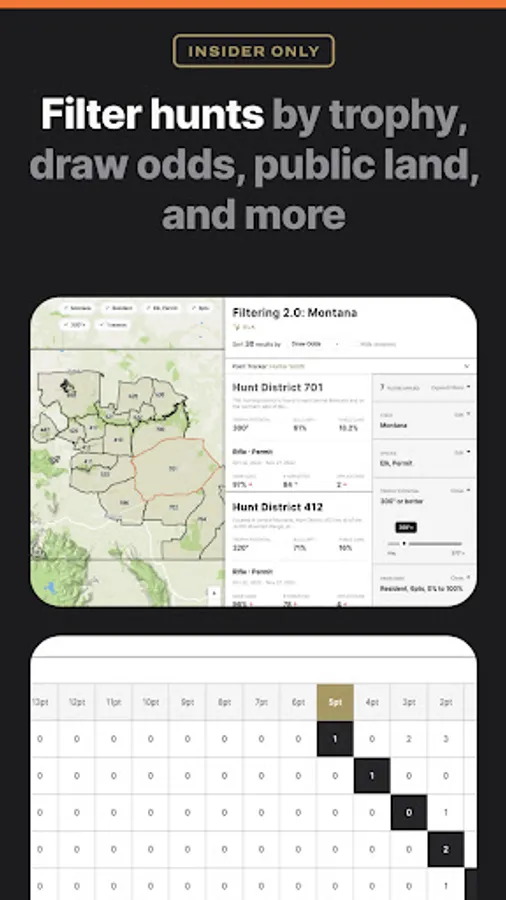 GOHUNT’s Insider research platform gives you even more tools to find tags or permits, research strategies, and in-depth hunt unit profiles. With the most advanced draw odds in the industry, innovative filtering and tag finding tools, and strategies and research articles from diehard hunters, you’ll wonder how you ever planned a hunt without it.