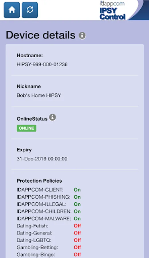 The "IPSY Control" app lets you configure protection policies for your HIPSY, GIPSY or BIPSY devices (available separately as part of our Cyber Protection Service) view activity reports, and enable Alert push notifications to your iPhone or iPad.