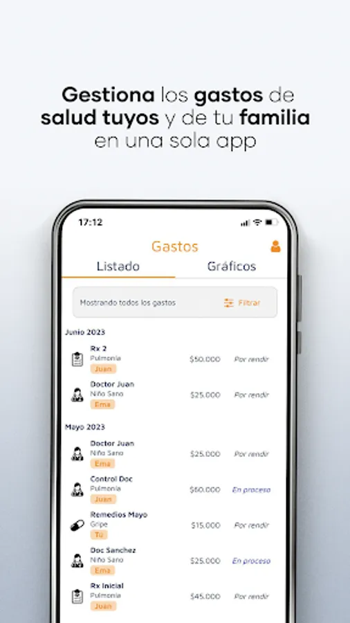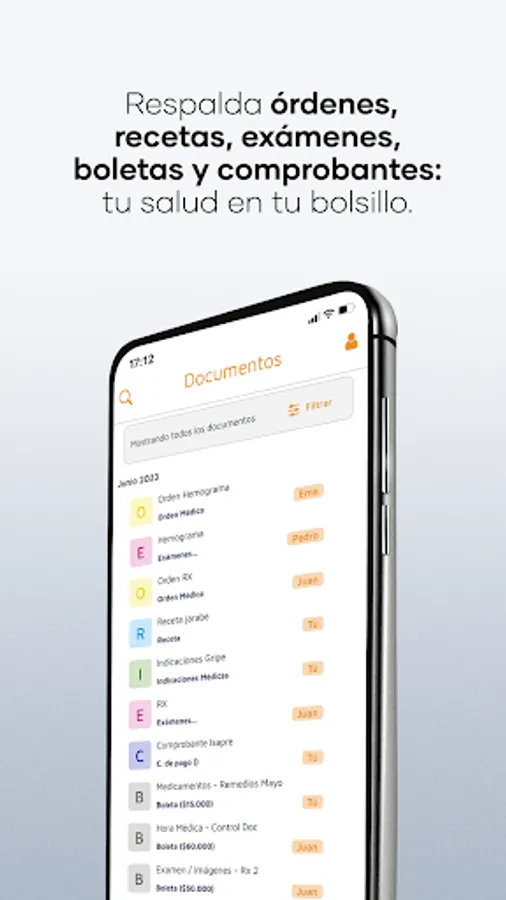 Upload and manage your health expenses in a simple way. Attach photos of tickets and receipts, and render them to your Isapre and/or Complementary Insurance instantly. Manage all your documents in one place: prescriptions, medical orders and indications, exams, etc. Access graphs and information to understand your health spending, both personal and that of your family.