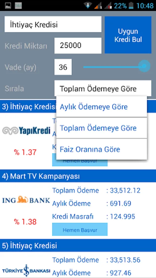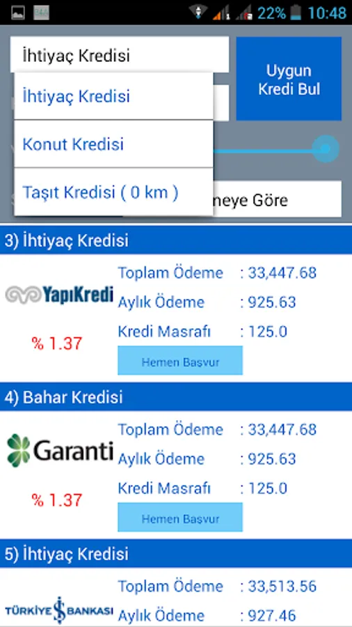 Consumer loans, housing loans (mortgage) or vehicle loans according to loan amount and maturity of the options you have requested lists based on the most accurate and current information. So instead of looking at each bank individually visible to all banks' loan packages on a single screen, you can find detailed information and even credit you can apply for loans.