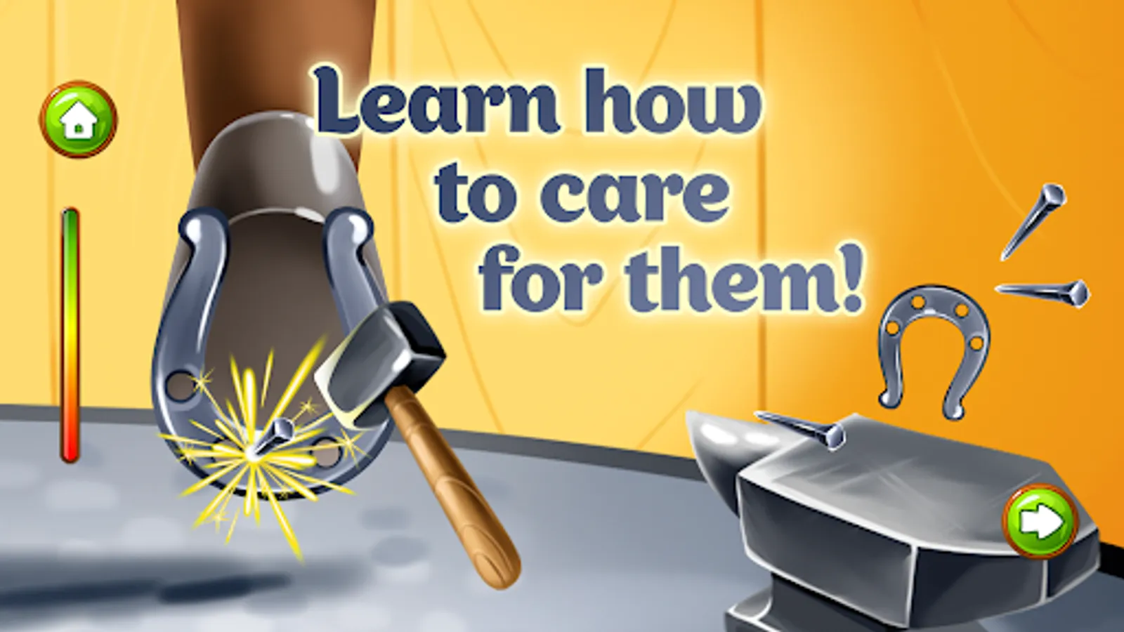 The task is to nourish the horse on the farm with some fresh hay. To heal the horse the kid attaches a horseshoe to the hoof, one by one, with the help of a hammer and nails. Then he should turn up the soil with a plow and take the harvest. Great animal games, aren’t it?