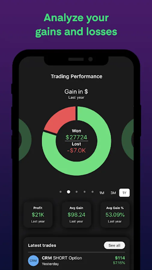 Whether you are a beginner or a professional, successful or struggling to make profit, there are certain metrics that are relevant for measuring how well you perform as a trader. In My Portfolio view, you will immediately see metrics such as your overall profit, average gain in both dollar and percentage and your winning trades in percent.