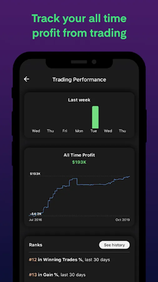 Kinfo tracks your trading performance and lets you view top traders portfolios.