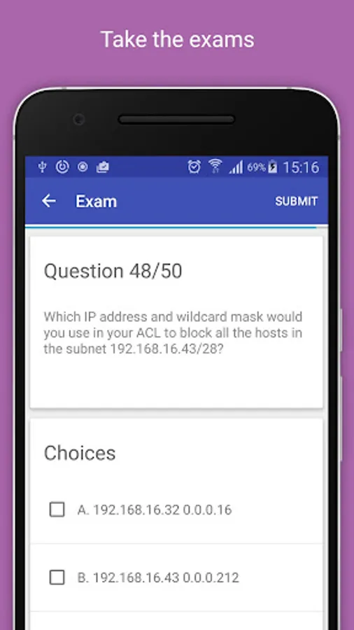 - Exam Mode consists of a simulation of the real exam. The questions are randomly generated each time. User can check the result, see the correct answer and the explanation after finishing the exam.