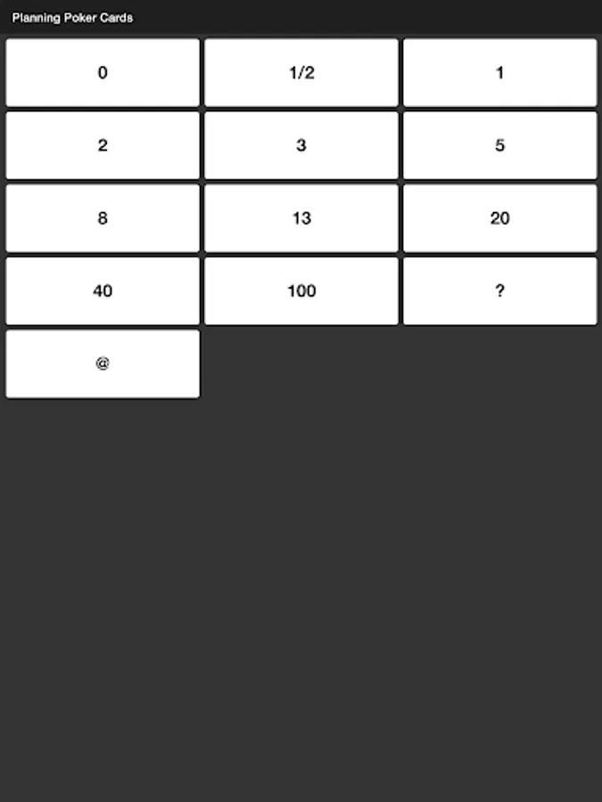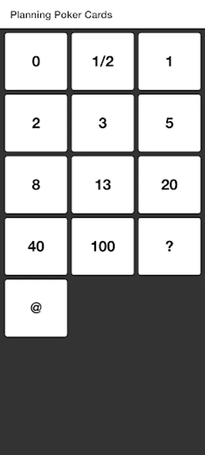 Planning Poker Cards app can be used in planning poker sessions anywhere. It includes the standard numbers, along with question mark and the commercial at card.