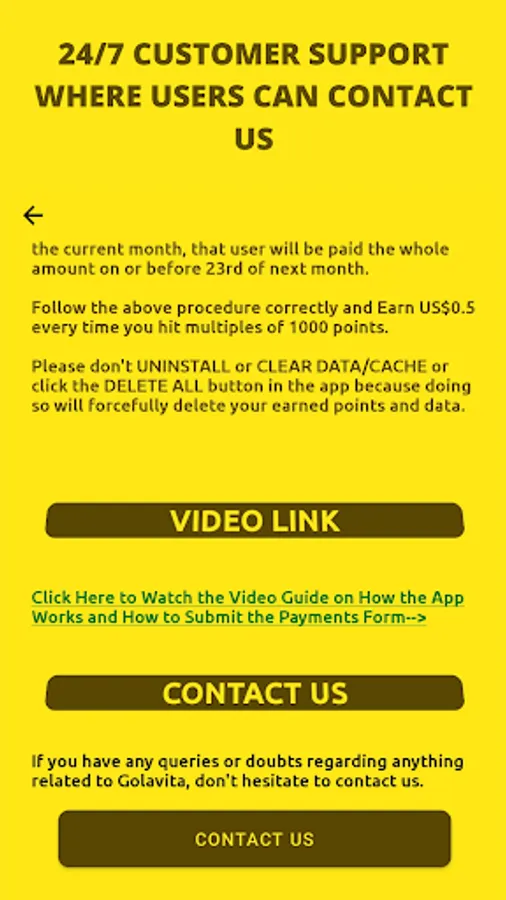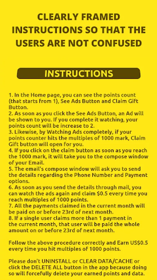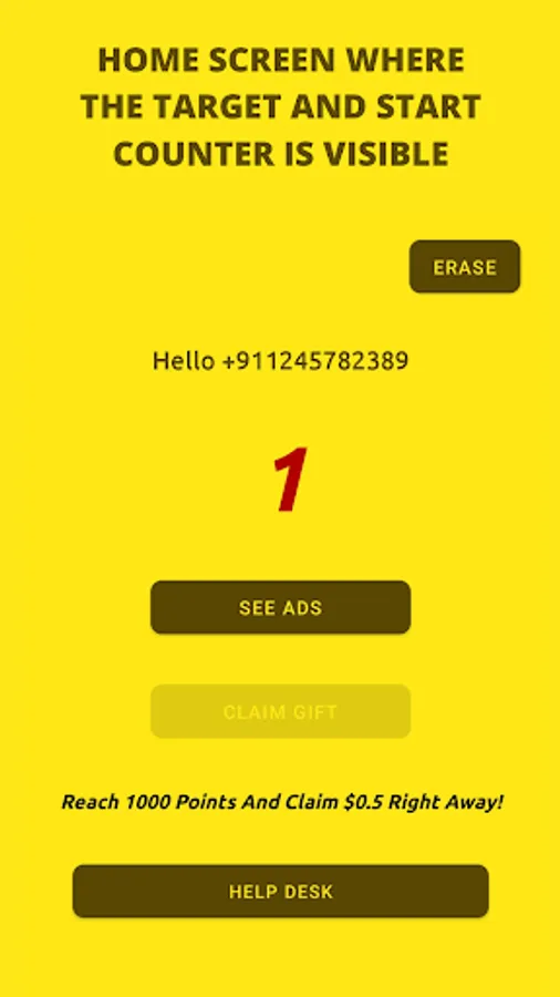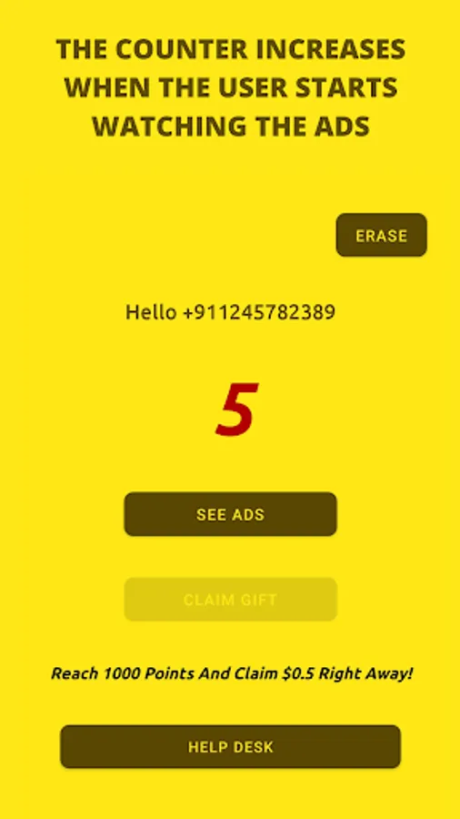 Golavita functions by showing ads to the users to earn money. The points counter in the home screen of the app starts from 1. A user is required to watch ads by clicking the earn point button on the home screen. When this process is complete, the points will increase to 2. Likewise, if a user hits multiples of 1000 points then that user can claim US$0.5 through a flexible mode of payments (PayPal[For International Users Only] / UPI/ Phone Pe/ Google Pay/ Bank Account). There are no limitations for earning through this app, any user can earn as many times by reaching 1000 points successfully. A reset button is provided when the user reaches 99001 points in this app.