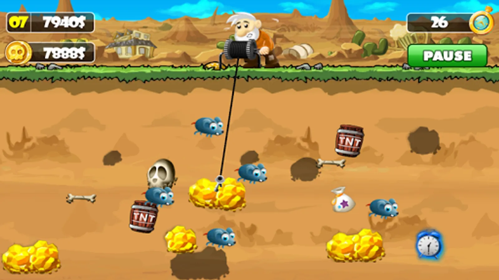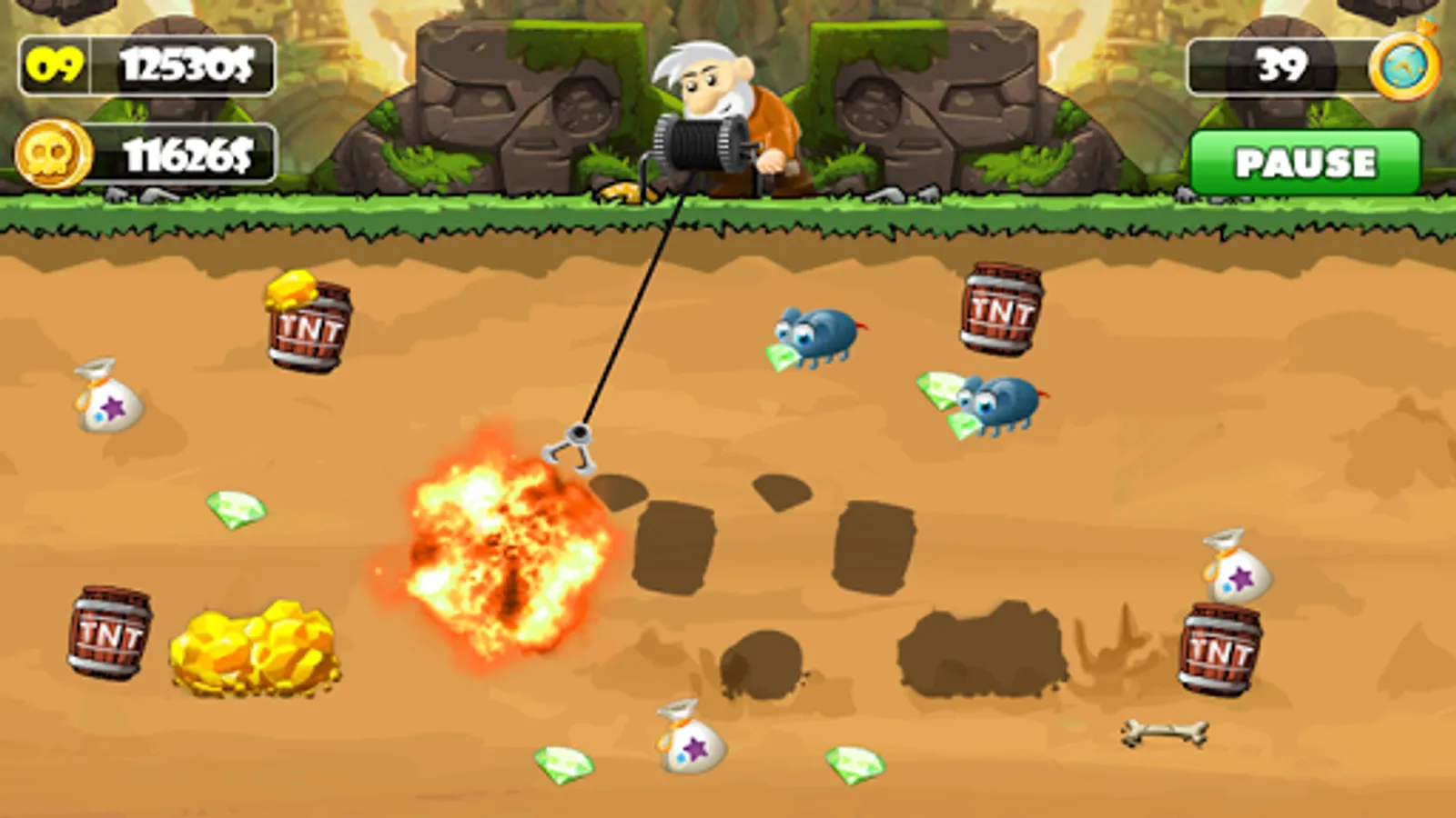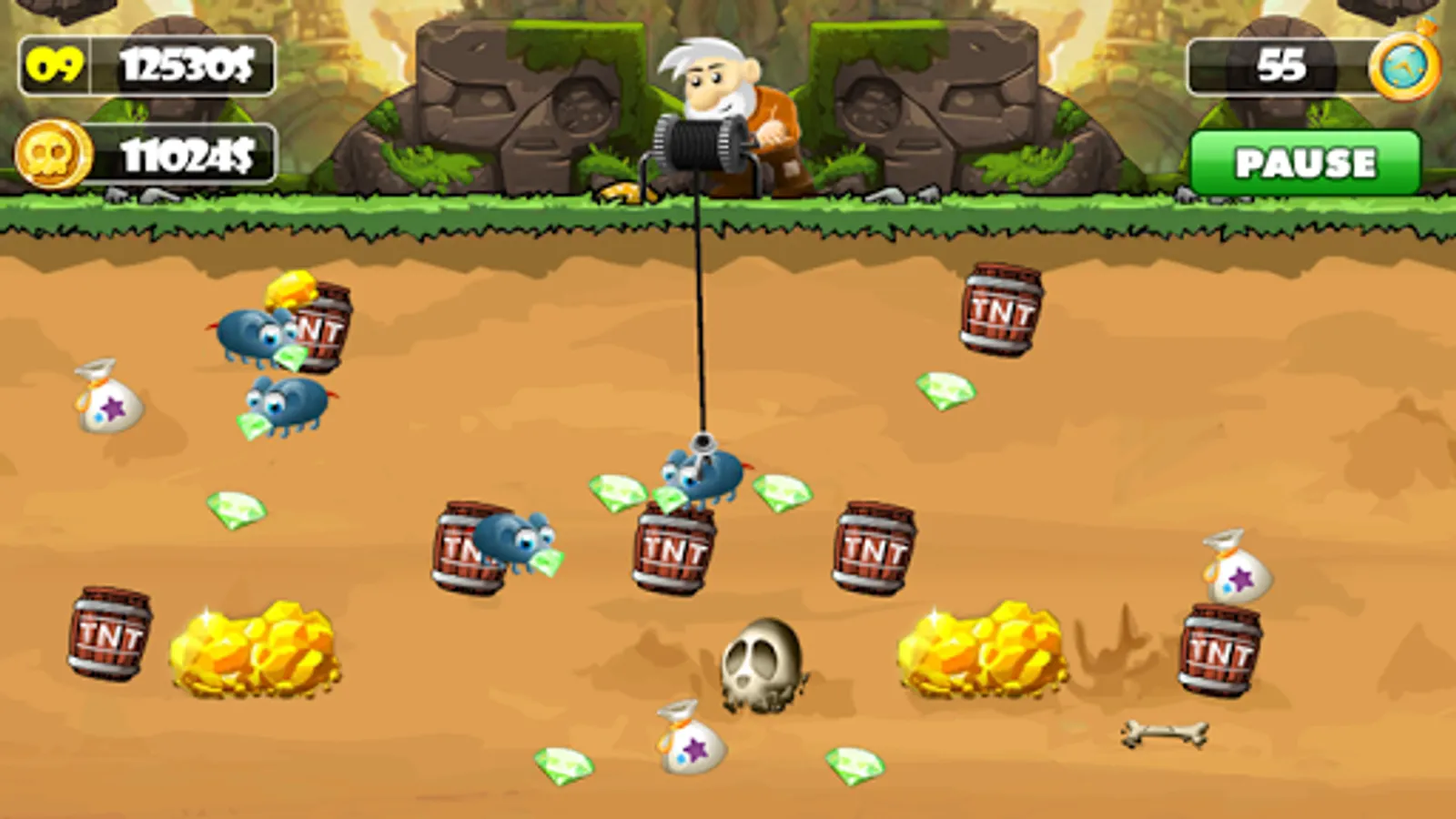 Use your claw and reel to mine gold and other treasures out of the earth. Your claw will swing back and forth. Tap screen to lower it. Once it has grabbed something it will reel it up. Heavy objects like rocks and large pieces of gold will be harder to reel up. Grab bags contain random amounts of money, a strength power-up, or a stick of dynamite. Between levels you can buy items that can help you.