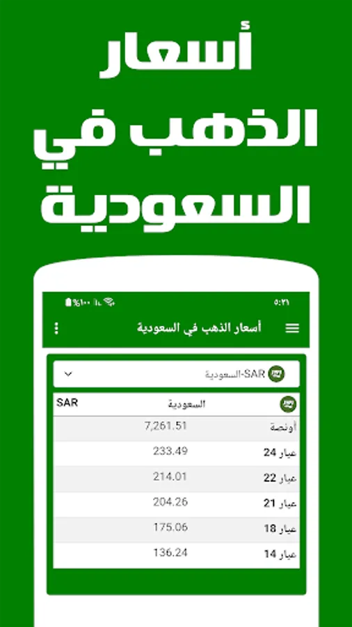The application of gold prices today in Saudi Arabia shows you the price of a gram of gold in Saudi Arabia for different gold karats (24 karat, 22 karat, 21 karat, 18 karat, 14 karat, 10 karat), it also displays the price of an ounce of gold, a gold pound and the price of a kilo of gold in riyals Saudi