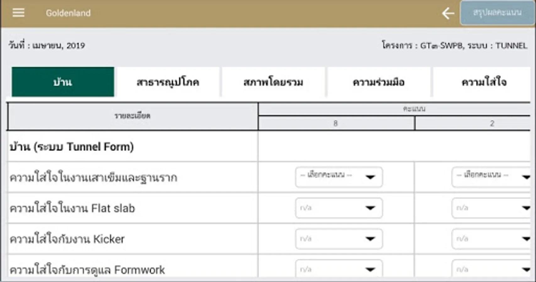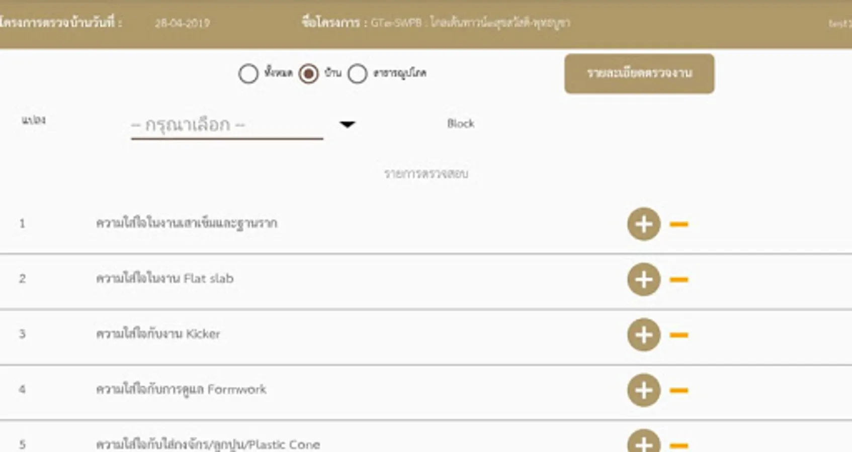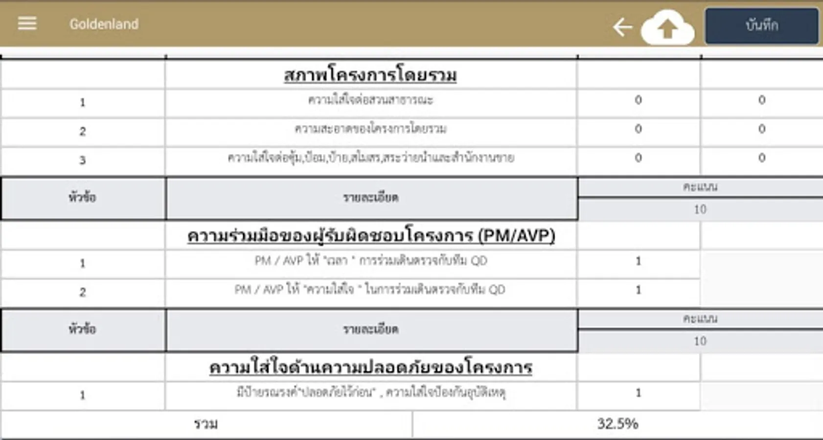 Golden Land Residences has a policy to improve the quality of construction to be of better quality. By using inspection and evaluation of construction quality scores Original inspection Reporting of work inspection and rating Will be done by the inspector and collect all the data using the program excel which takes a lot of work time As well as having the opportunity to make mistakes from such work