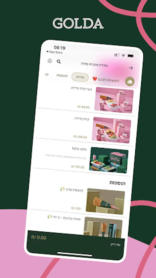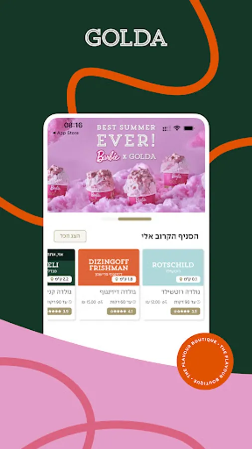 In the Golda delivery app, you can know that you will always receive courteous, fast and personal customer service (with real people and not bots or chats!) who are available at *9633 to listen to any request. You can also order through them from any branch in Israel your favorite Golda and other treats in the app. And if that's not enough, we invested especially in creating a designed, fun and experiential interface that will make you smile long before the best ice cream ever arrives at your home.