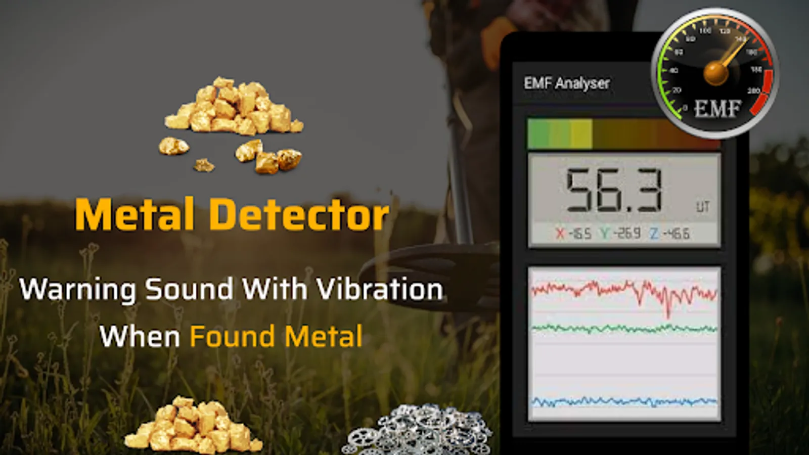 Metal detector and gold detector is here to track metal and gold particles. Get install the Gold detector metal finder app with best features to detect metal around you. Gold detector and scanner app will detect Metal objects, Gold & hidden object with your mobile phone. Find the metal and gold with magnetic field and electromagnetic wave with the help of your mobile device.