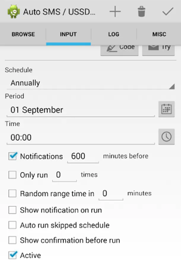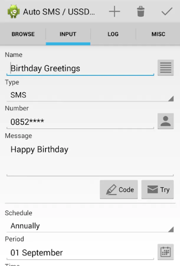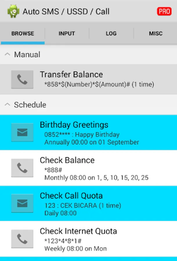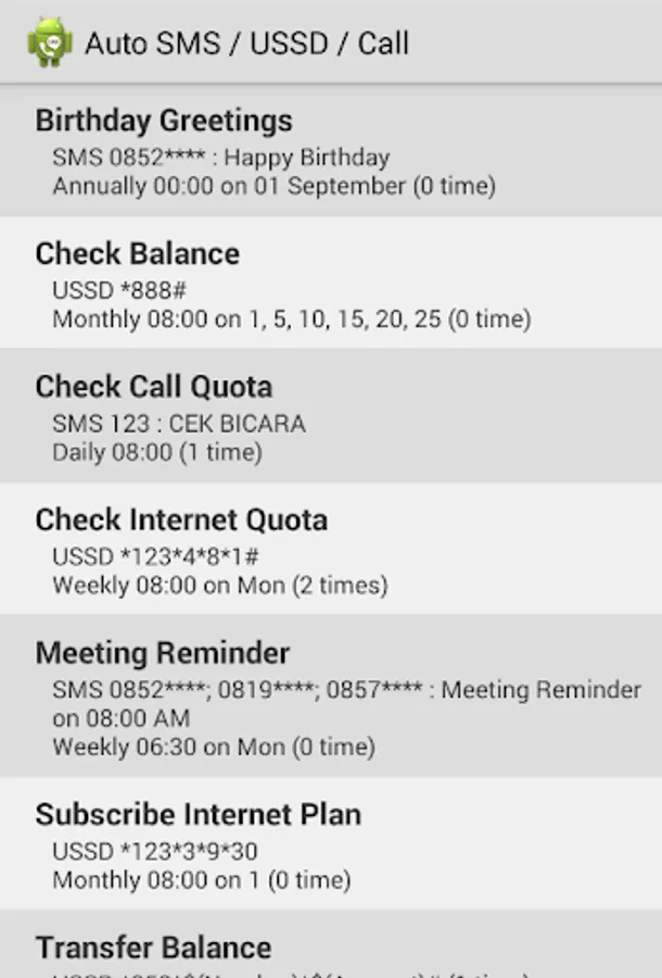 Automatically send SMS / USSD / Call on schedule (daily, weekly, monthly, annually, once, number of days, after call).