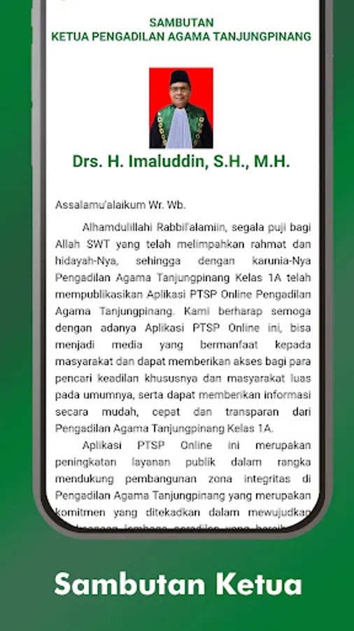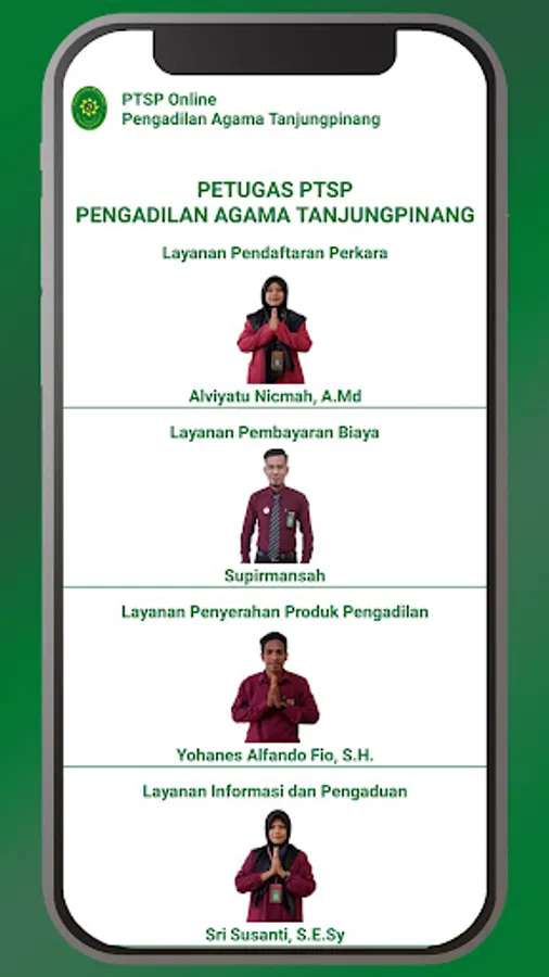 This Online One Stop Integrated Service (PTSP) application is an action of change/innovation to improve public services in order to support the construction of the Integrity Zone at the Tanjungpinang Religious Court which is a determined commitment in realizing the implementation of a judicial institution that is free from corruption as well as the implementation of a clean and serving bureaucracy.
