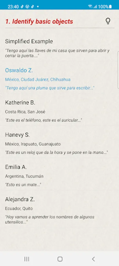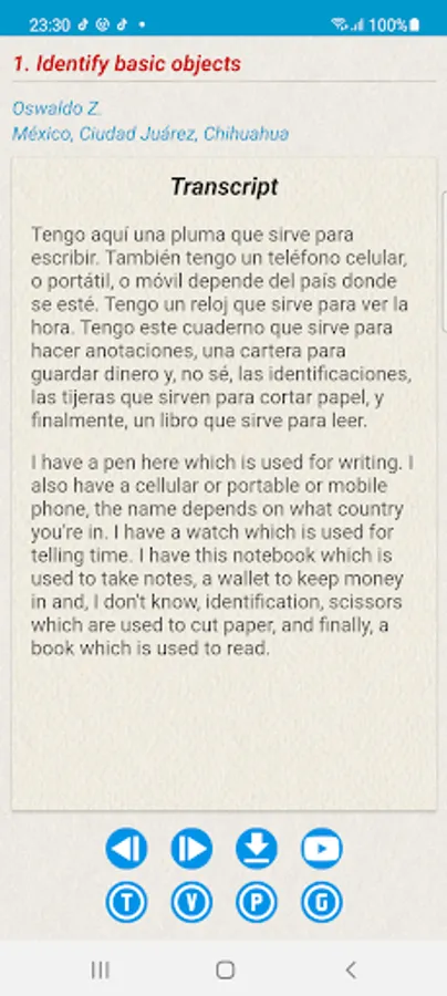 Spanish Proficiency Exercises is a compilation of brief video clips in which native speakers of Spanish from various locations throughout Latin America and Spain demonstrate various language tasks. The objective of the exercises is to provide students of Spanish with the necessary tools to be able to talk about the same topics in Spanish. In order to do, this Spanish Proficiency Exercises contains five major components. First, there is a simplified video clip. This simplified version is scripted, the native speakers talks slower, and he or she uses simpler words and less slang. Second, there are video clips of native speakers who also perform the proficiency tasks. These clips are not scripted. What the native speakers say is what they really said. Some may talk fast, others talk slow, and some have specific regional dialects.