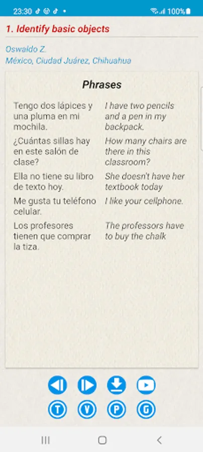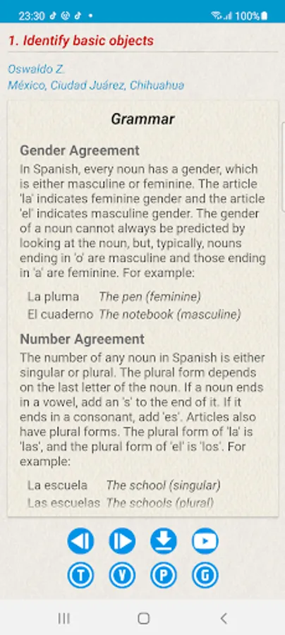 Third, to help perform the same task, we provide a Spanish/English glossary of vocabulary words that students may need in order to talk about the topic. Fourth, we also provide sample sentences that one may want to use in order to talk about the topic. Finally, we offer a brief, mini-grammar explanation on some grammar principle that is related to the proficiency topic. After reviewing the simplfied version, the vocabulary, the phrases, the grammar, and the video clips of the native speakers, we believe that students will be more prepared to perform the same proficiency tasks.