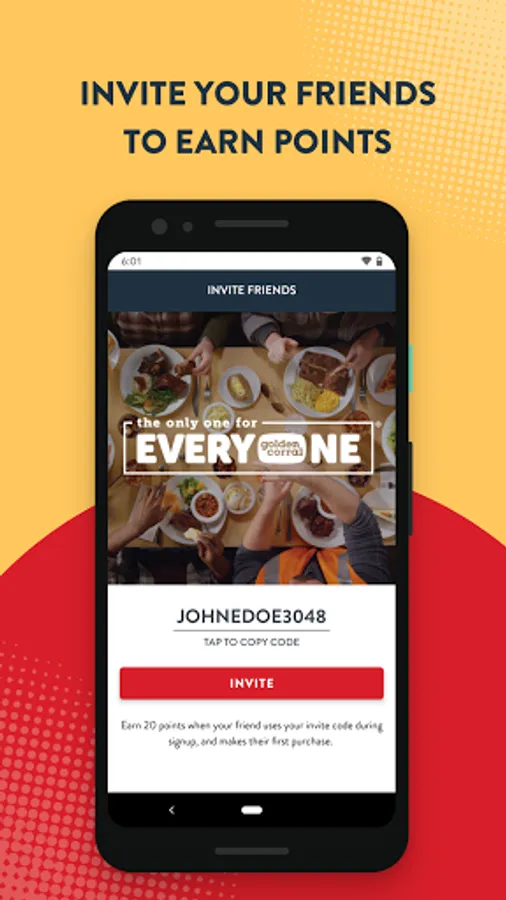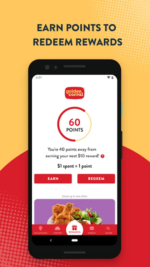 Register for Good as Gold Rewards and earn points automatically when you order through the app. Scan your code or upload your receipt to earn points for dining at your local Golden Corral. Earn bonus points for referring friends and family. Get rewards for registering, through earning points, and on your birthday.