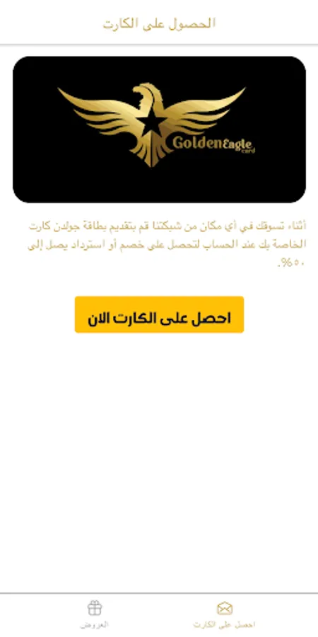 The Golden Eagle application allows you to know the network of discounts available for use and all the offers offered by Golden Eagle, where the Golden Eagle card gives you discounts of up to 50% from more than 100 service providers and various offers that include all markets and specialties